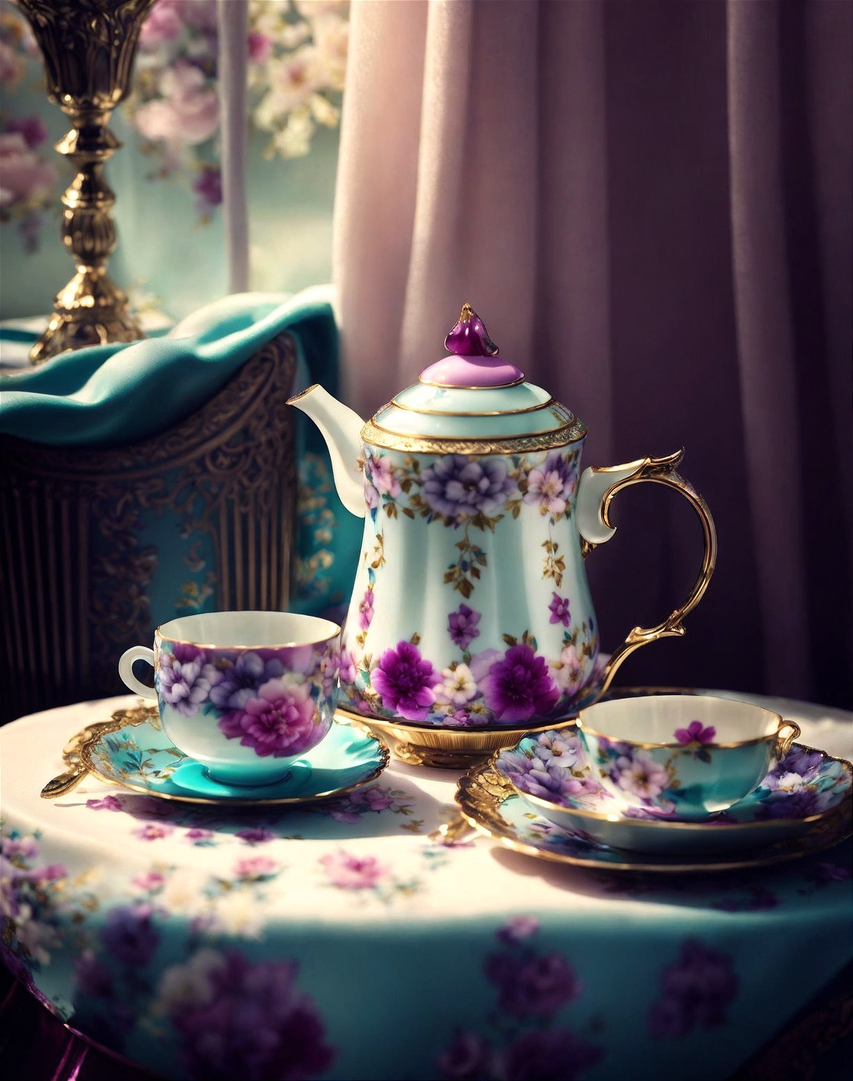 ::::: OLD STABLE VERSION ::::: Elegant vintage teapot and cups with floral design on a draped table, near a window with purple curtains and a classic chair.