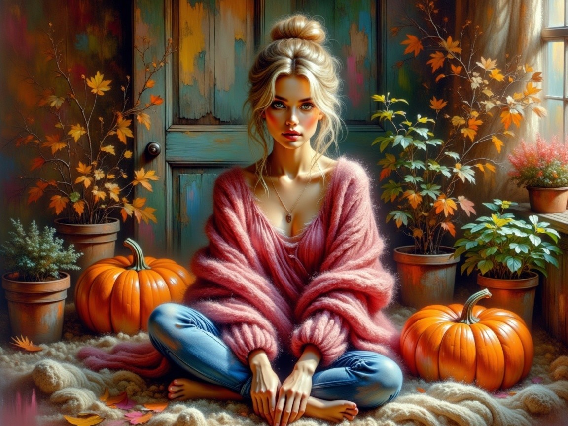 A serene autumn scene features a young woman in a cozy pink sweater, sitting among pumpkins and potted plants. Warm, earthy tones and soft lighting create a peaceful ambiance.