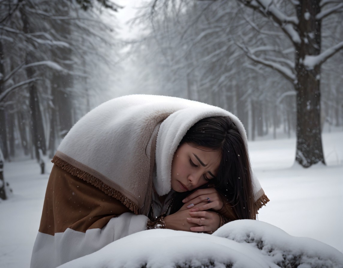 A person is kneeling in a snowy forest, wrapped in a shawl, with their head bowed and hands clasped, conveying a sense of contemplation or sorrow.