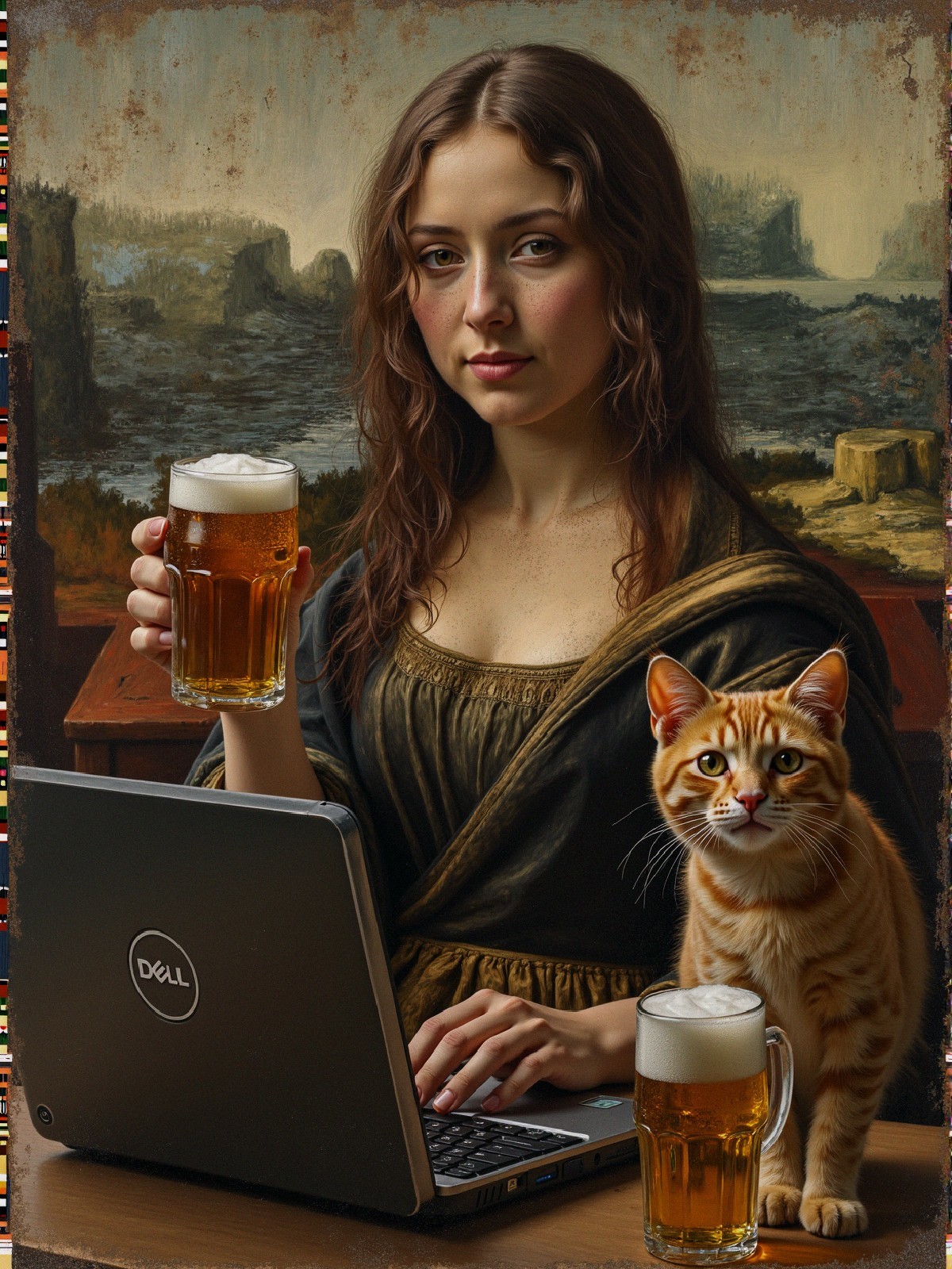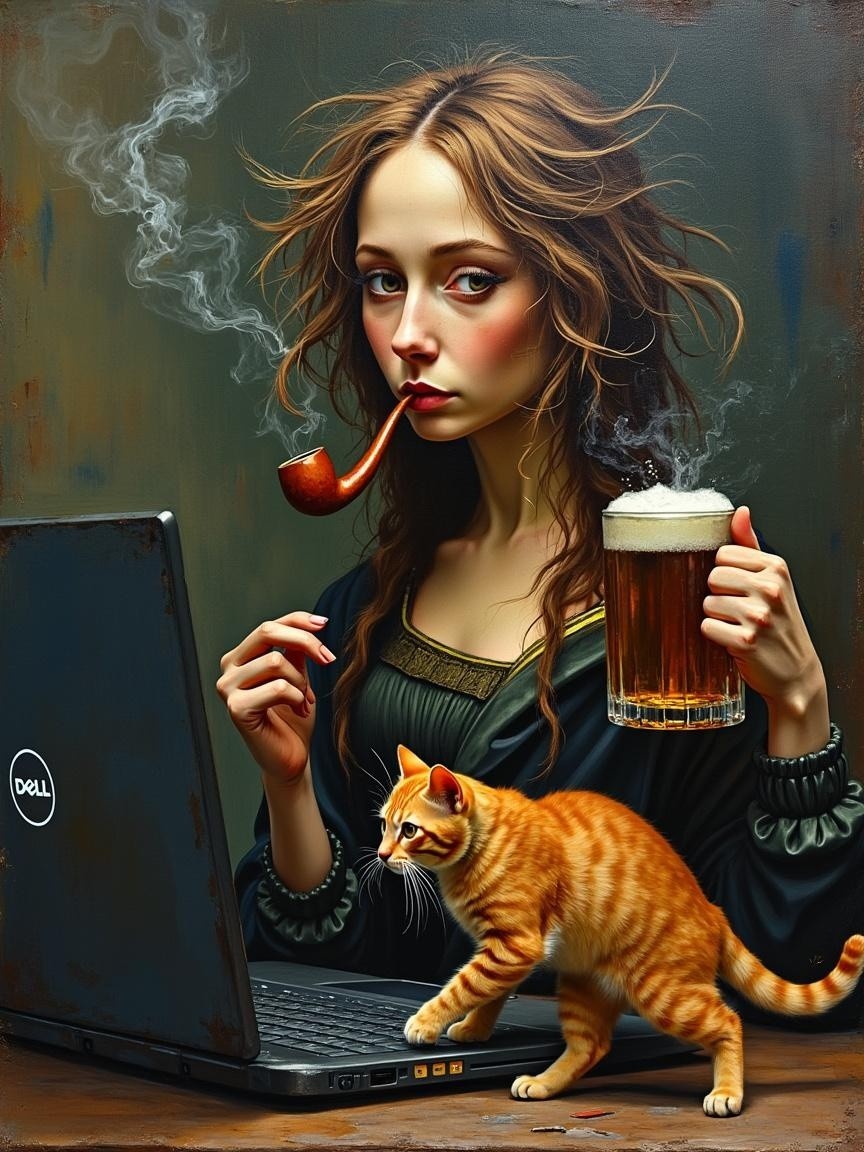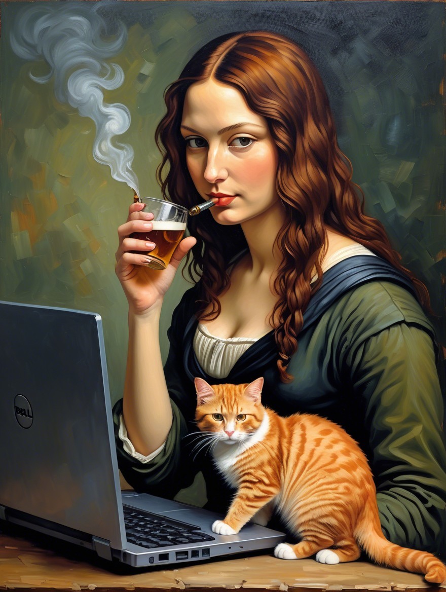 A woman with long, wavy hair sits at a desk, sipping a drink and smoking. A cat rests beside her on a laptop, blending modern life with classic portraiture.