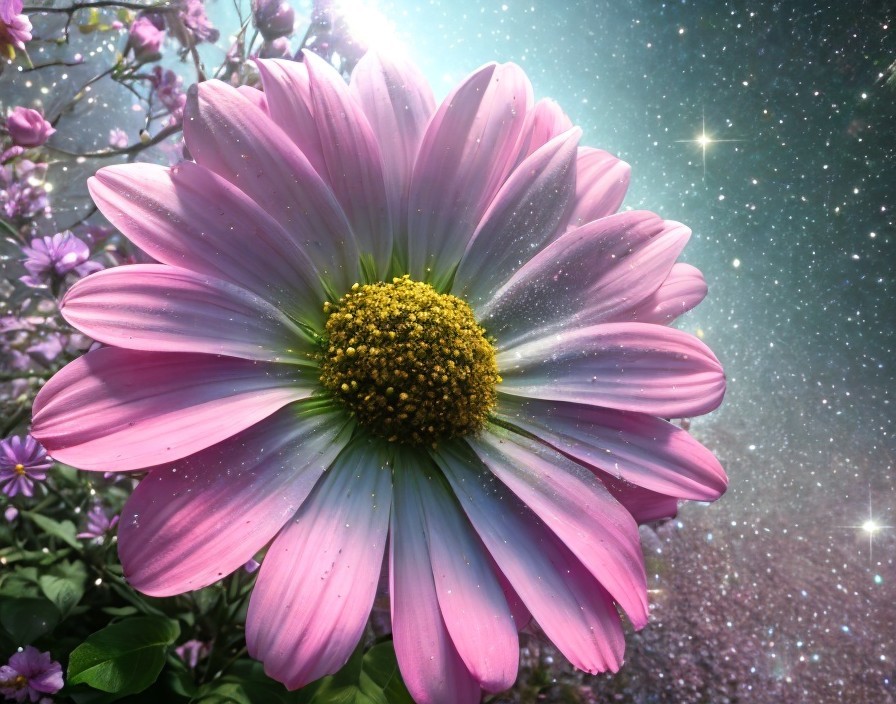 Pink Flower with Yellow Center Surrounded by Celestial Background