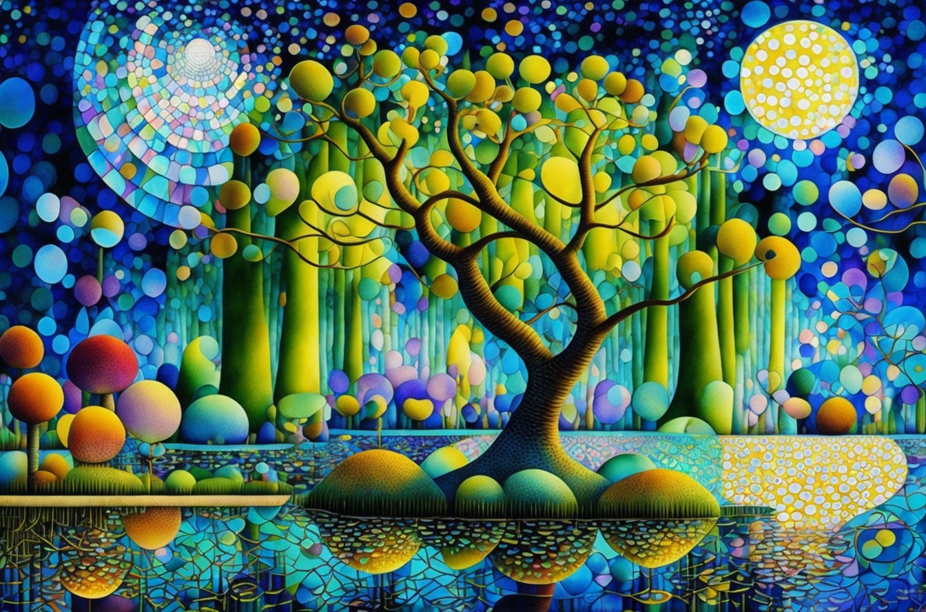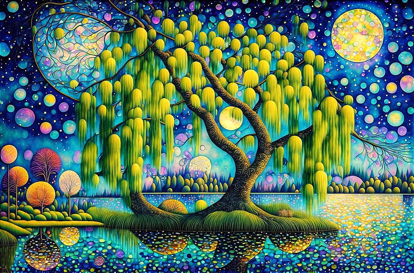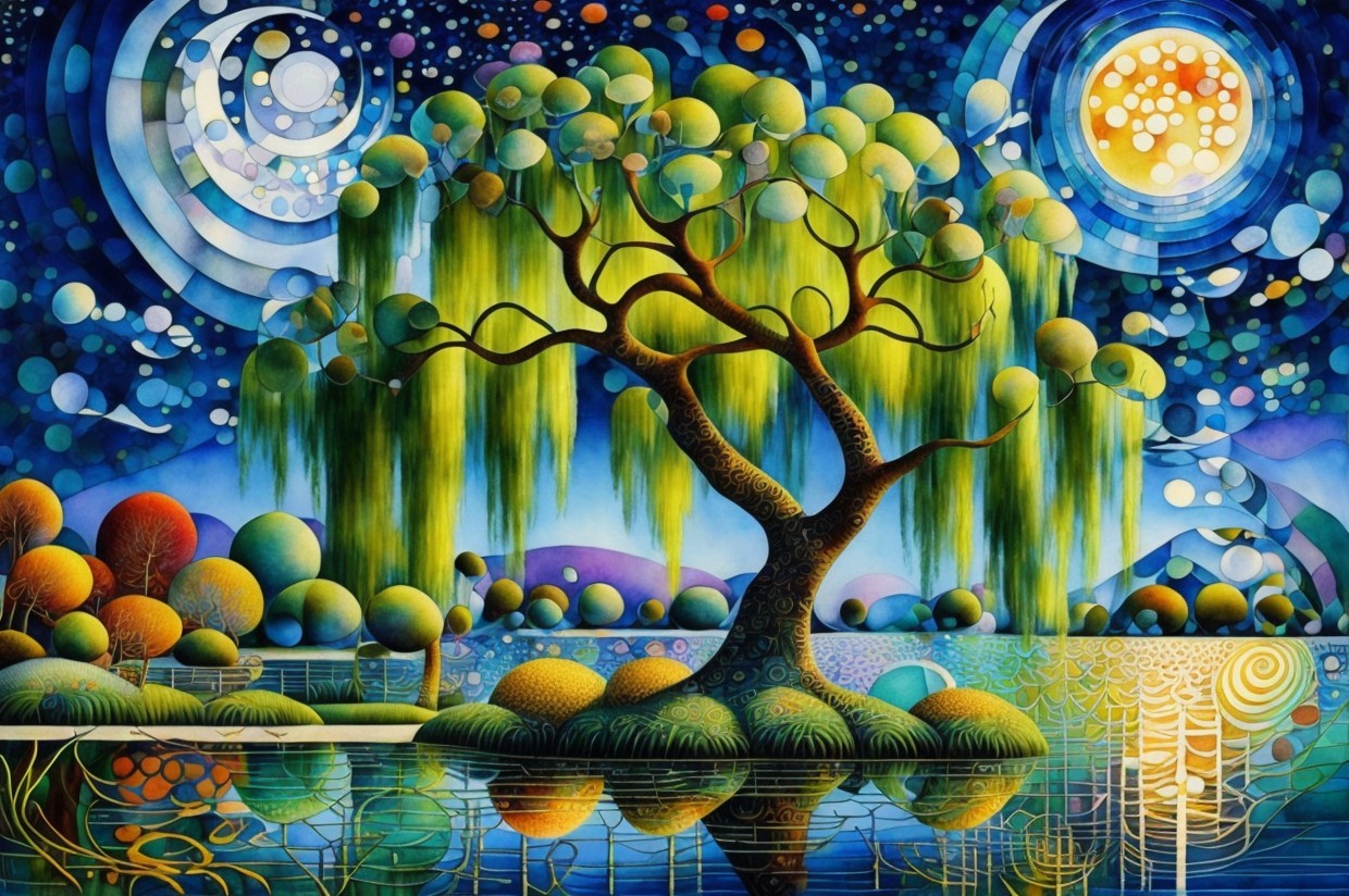 Colorful painting of whimsical tree with weeping willow leaves by lily pad pond under star