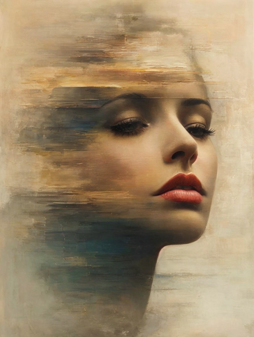 The image features a beautifully abstract portrait of a woman, with soft, blurred features blending into a serene background of warm and cool tones, evoking a dreamlike quality.