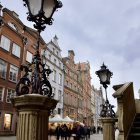 The image depicts a vibrant, historic street scene filled with ornate buildings, vintage lampposts, and bustling market stalls. People in period costumes stroll along the cobblestone path under a cloudy sky.