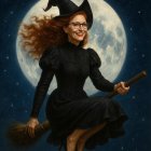 Prompt: mature beautiful smiling redhead Irish fashion model as glamorous witch riding a broomstick by the moon, age 45, thin red lips, big gaunt cheekbones, lovely blue eyes, black eyeliner, beautiful mature face, glasses, long curly reddish auburn hair blowing in the wind, high neck black Renaissance dress with puffy shoulder and front laced up bodice, black pumps, midnight blue sky sprinkled with sparkling stars