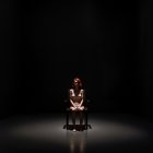 A woman sits confidently on a chair in a dark setting, wearing a black outfit with a hint of elegance. Her red hair contrasts with the deep shadows around her, creating a striking visual.