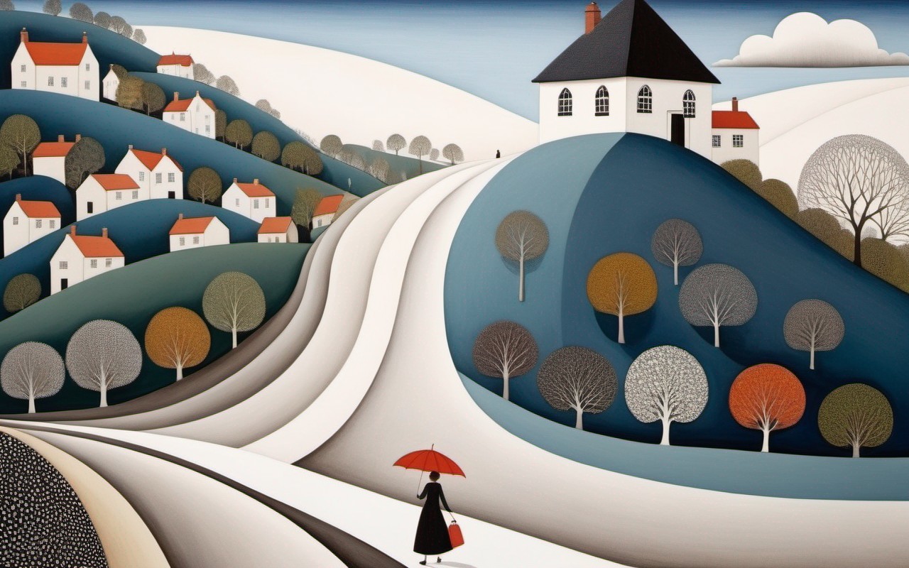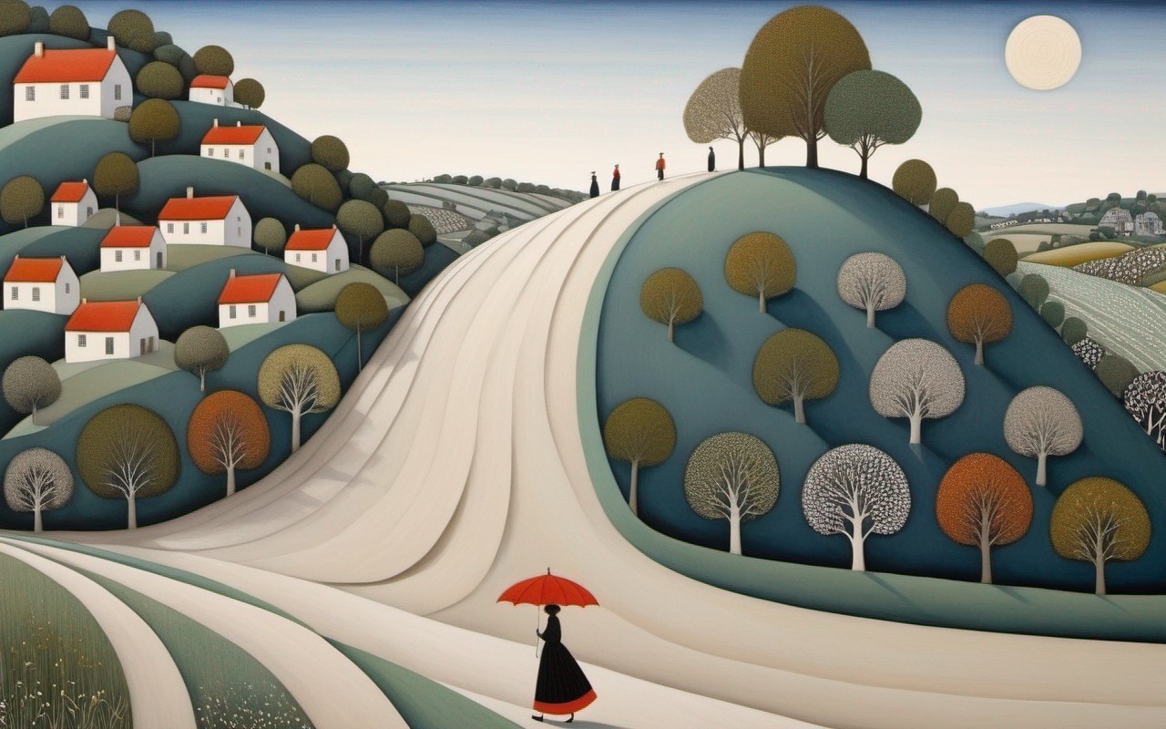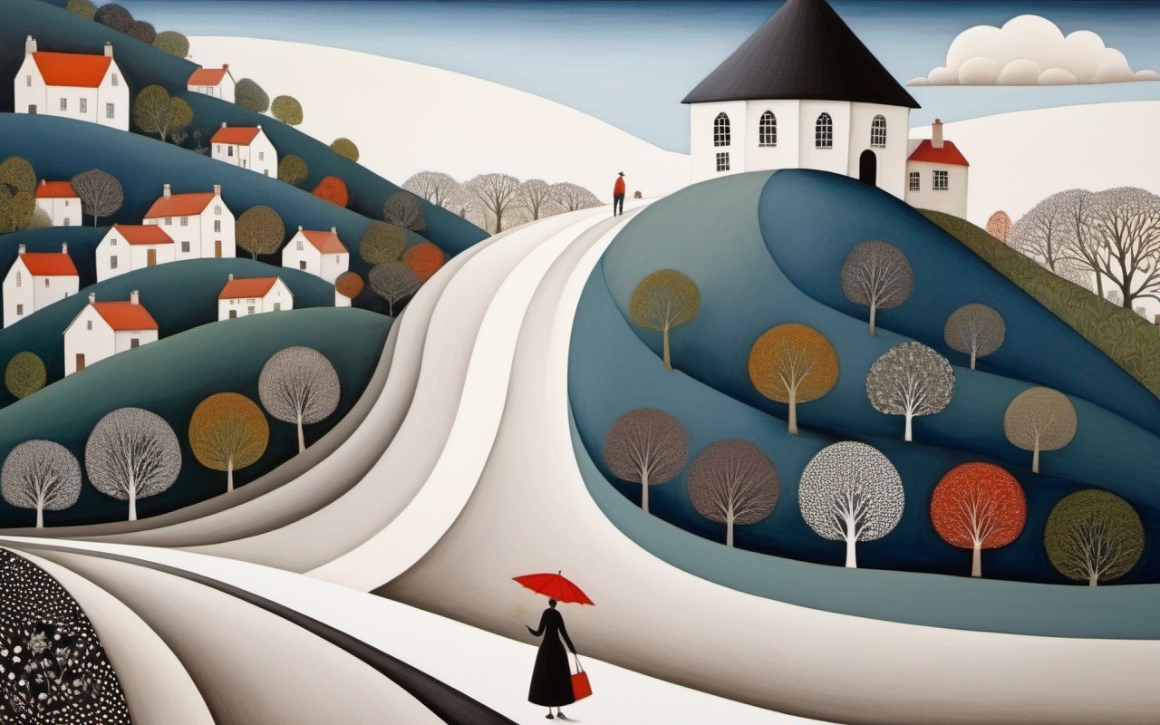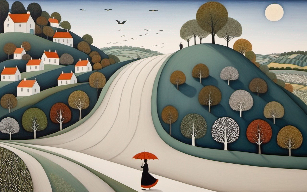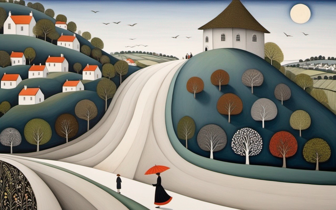 Two stylized birds in a wintry landscape with snow-covered hills, bare trees, and a crescent moon in the sky.