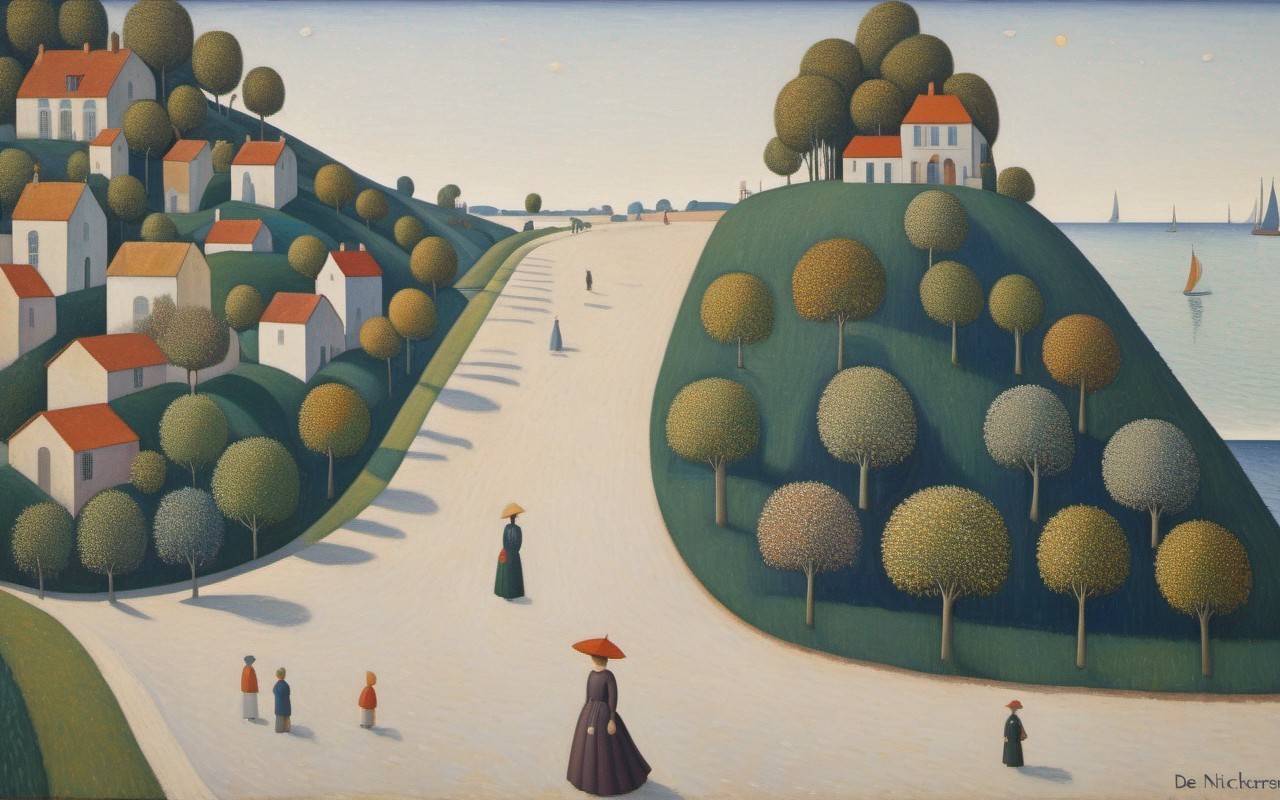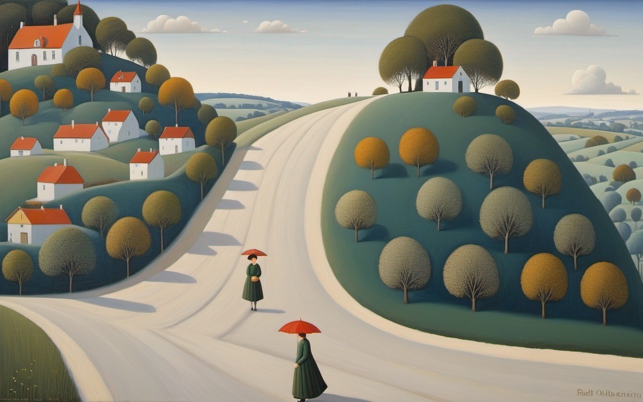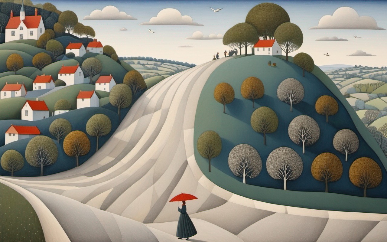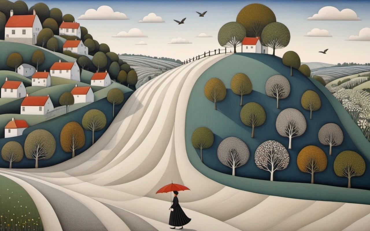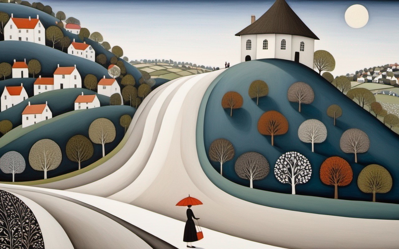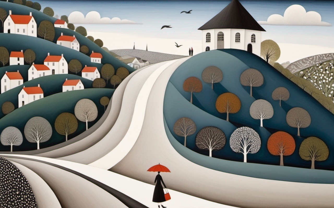 Two stylized birds in a wintry landscape with snow-covered hills, bare trees, and a crescent moon in the sky.
