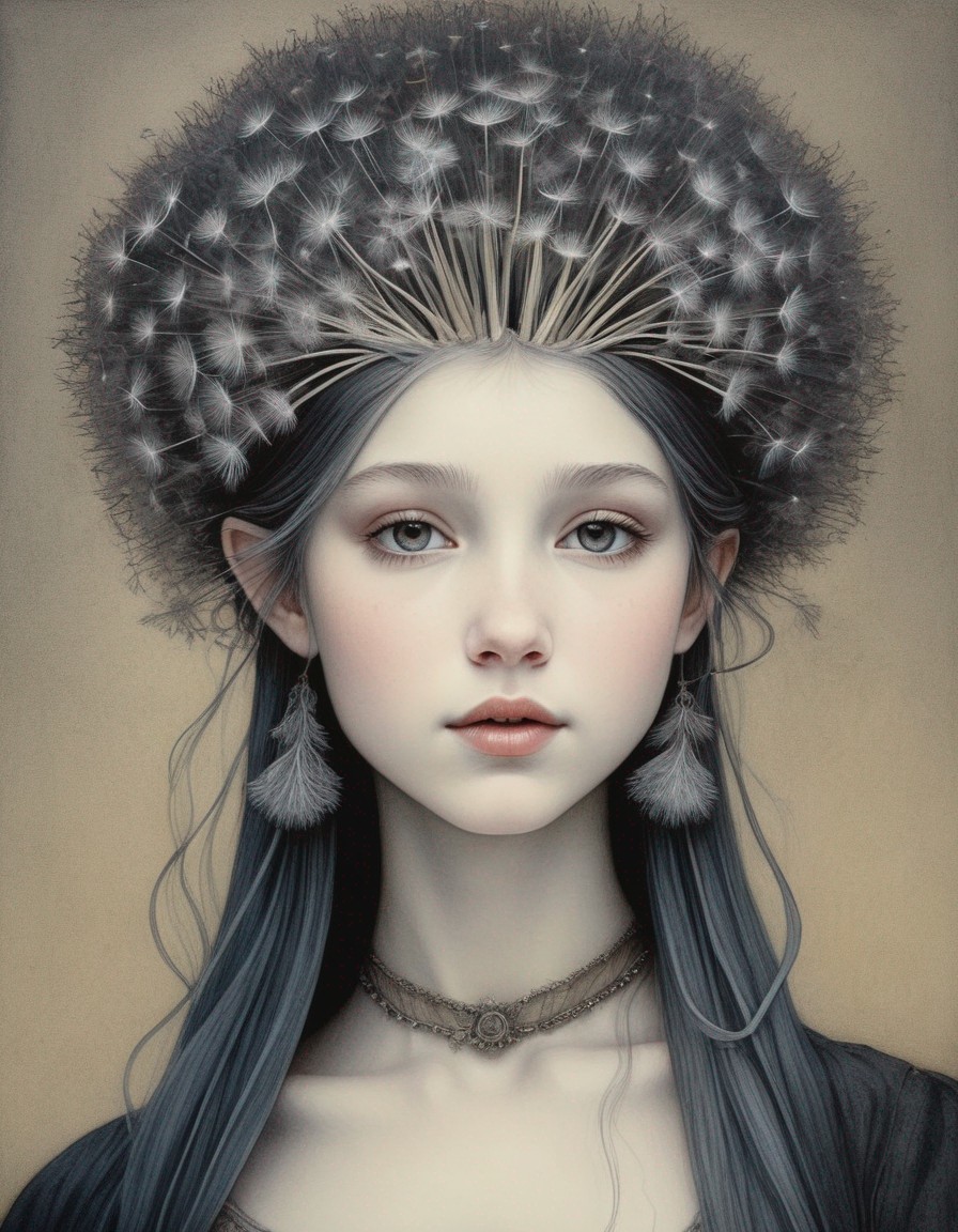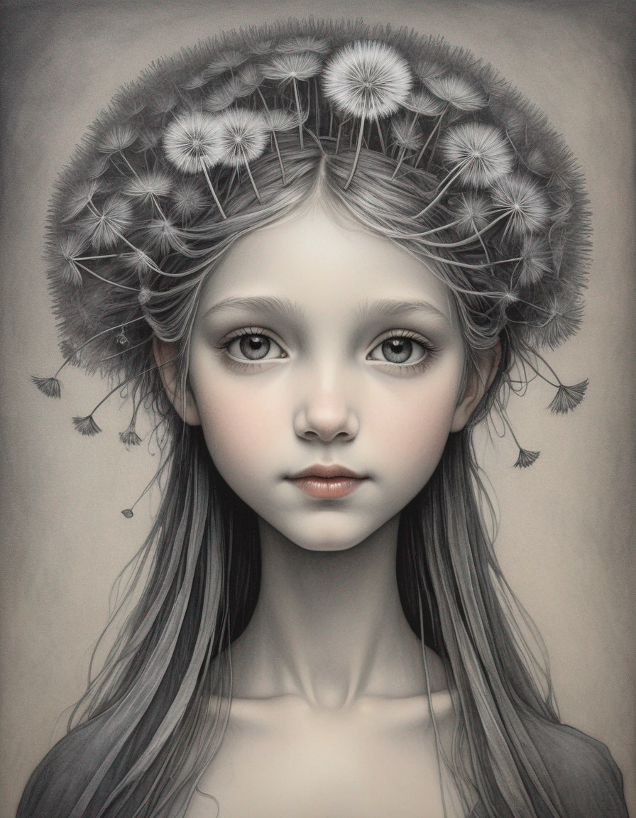 Monochrome portrait of a girl with an ethereal dandelion halo and a serene expression.