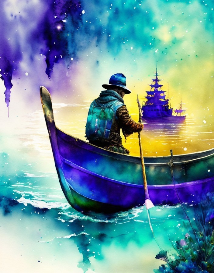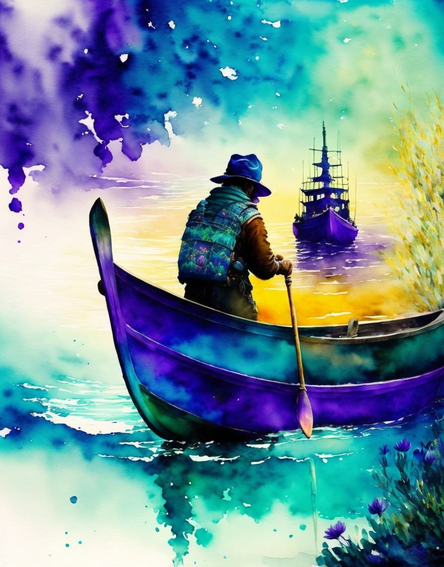 A person in a hat rows a vibrant blue boat towards a ship against a psychedelic, colorful backdrop of blues, purples, and yellows.