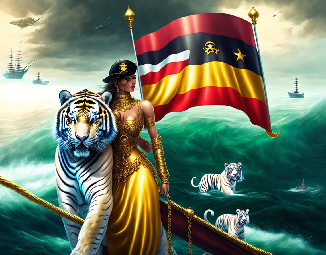 A woman in golden attire rides a white tiger by the sea with ships and a flag with chains underwater and flying birds.