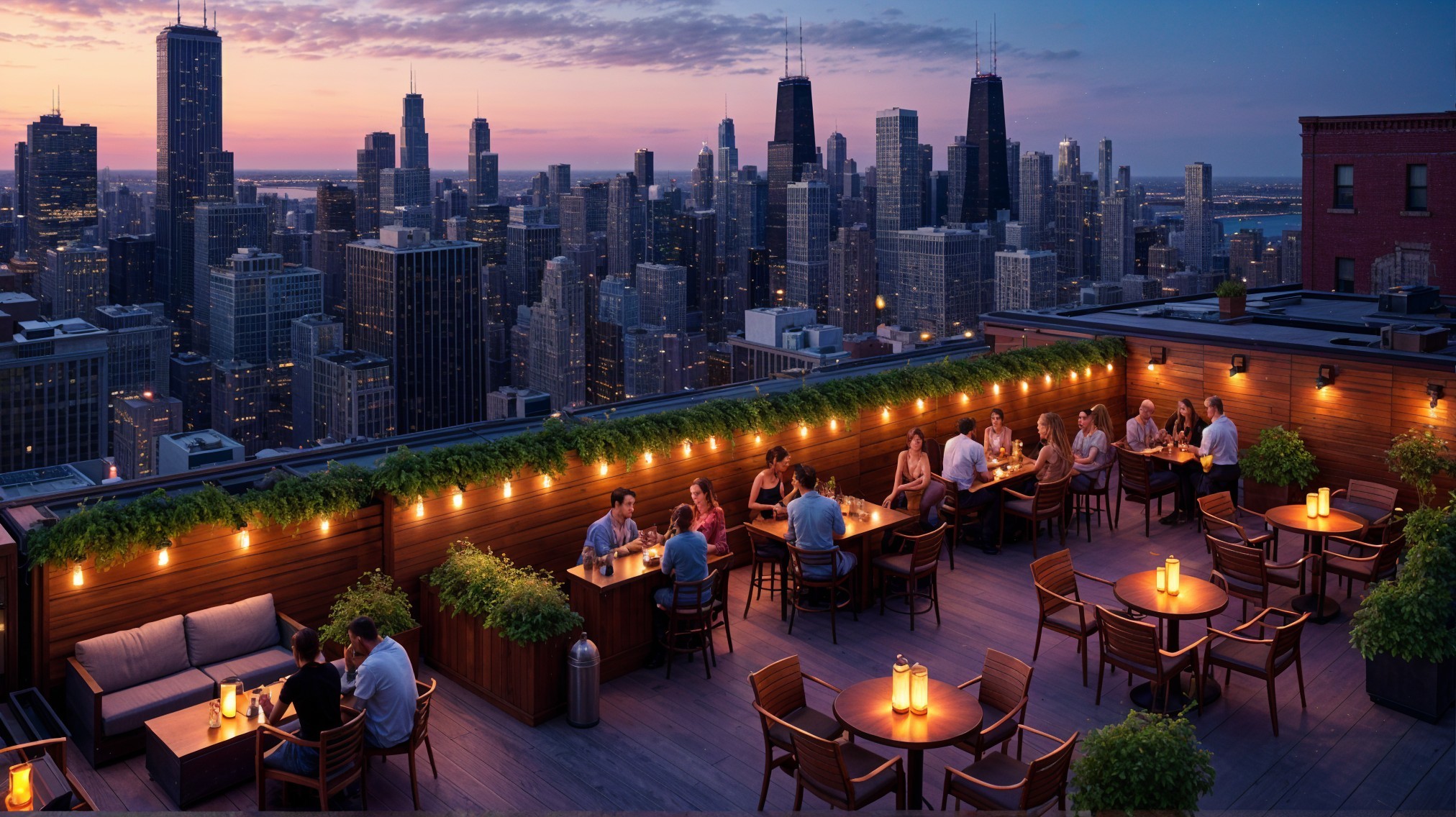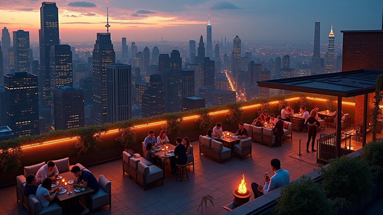 A stylish rooftop bar offers stunning city skyline views at sunset. Guests mingle around cozy seating and warm fire pits, enjoying a vibrant urban atmosphere filled with lights and laughter.