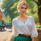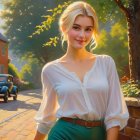 Blonde Woman in Sunlit Street Surrounded by Greenery