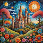 A vibrant fairytale scene features a whimsical castle surrounded by colorful trees. A decorative tea cup sits on a table, inviting the viewer into this enchanting world of magic and wonder.
