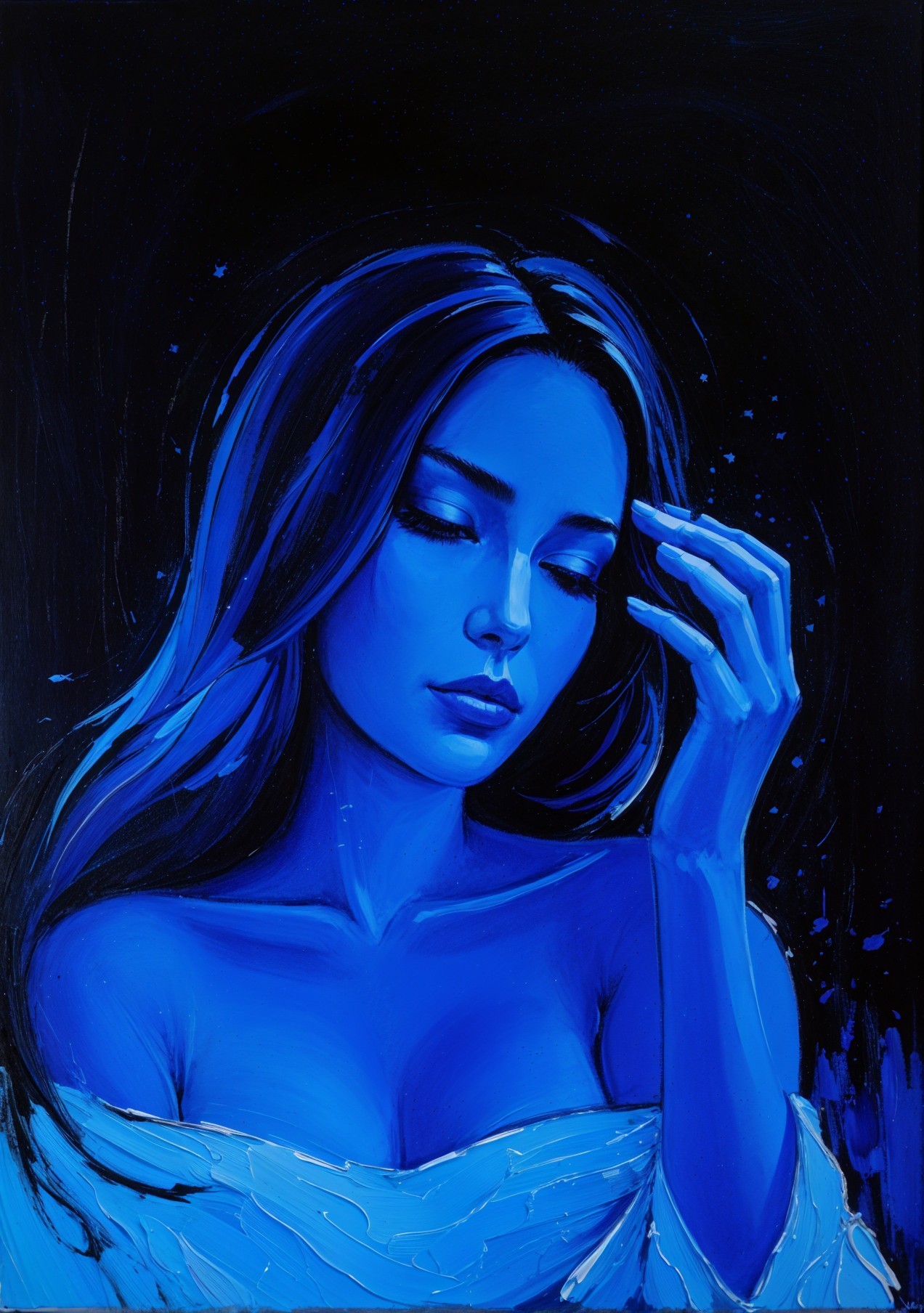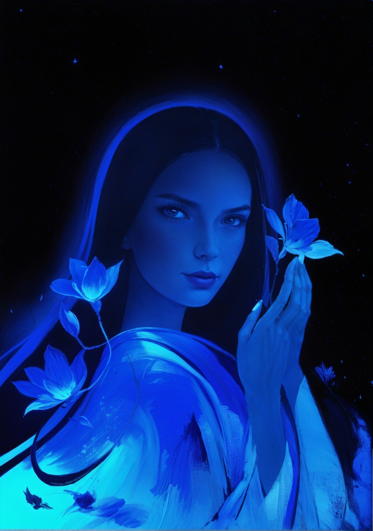 A striking portrait of a woman with flowing hair, rendered in vibrant shades of blue. The background features splashes of color, enhancing the ethereal and captivating aura of the subject.