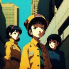 Three stylish women in futuristic outfits and bold hairstyles pose against a modern city backdrop, wearing striking helmets. Their vibrant clothing and makeup add to the chic, retro-futuristic aesthetic.
