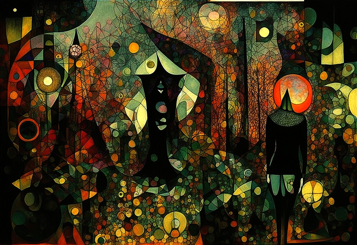 A surreal, colorful forest scene features dark trees and whimsical figures. A menacing figure in black contrasts with a glowing orange orb, creating a mysterious, enchanting atmosphere.