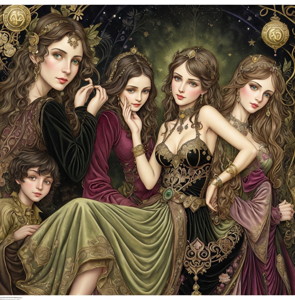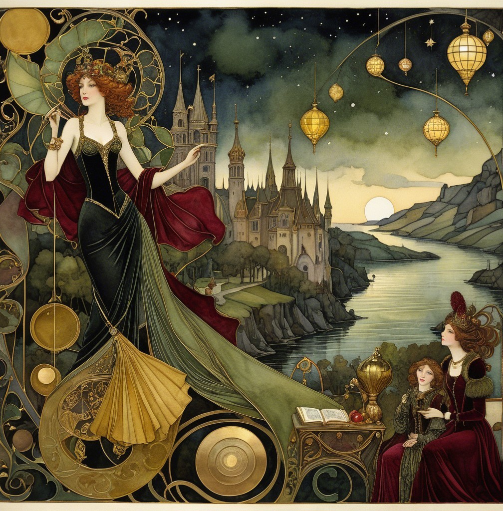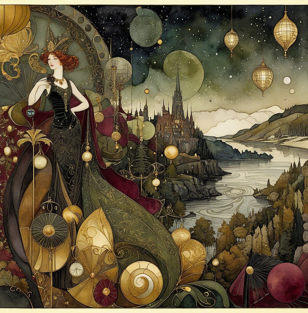 Art nouveau New Year’s Eve fantasy party,, 3rd century European miniature art. Velvet Black, Shabby, Dull Gold, olive green, burgundy, Golden Ratio, Surreal Fantasy, Elegant, High Definition Ultra Fine 3D Line, Zenangle Style, Watercolor Patchwork , Arthur Rackham Style, Paul Kidby, Gediminas Prankevicius, Jacek Jerka, Extremely Detailed, Intricate, Thoughtful, HDR, Fractal, Beautiful, Award Winning, Fantasy Look, Fantasy, Crisp Quality