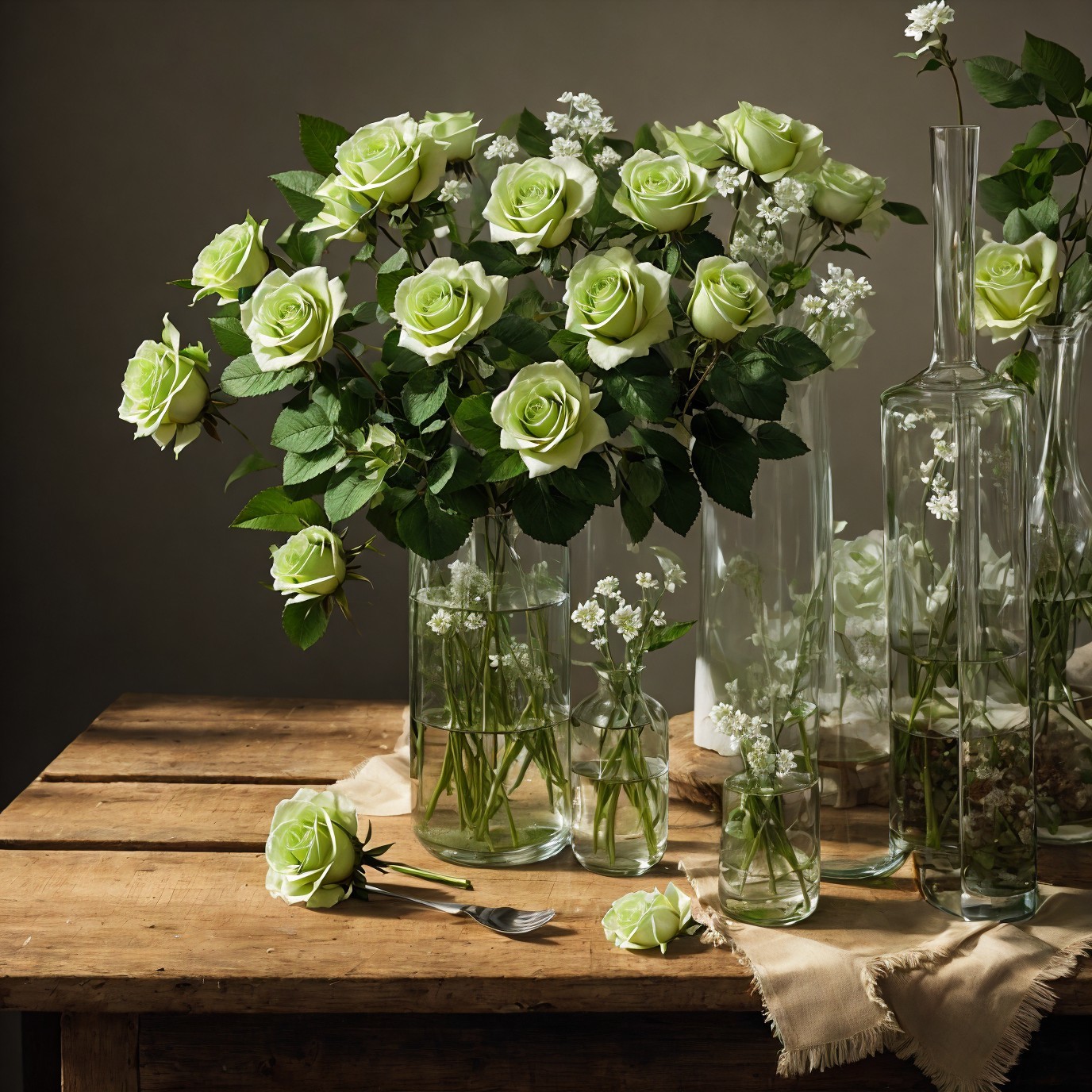 A rustic wooden table holds clear vases filled with elegant white roses and sprigs of baby's breath under soft lighting.
