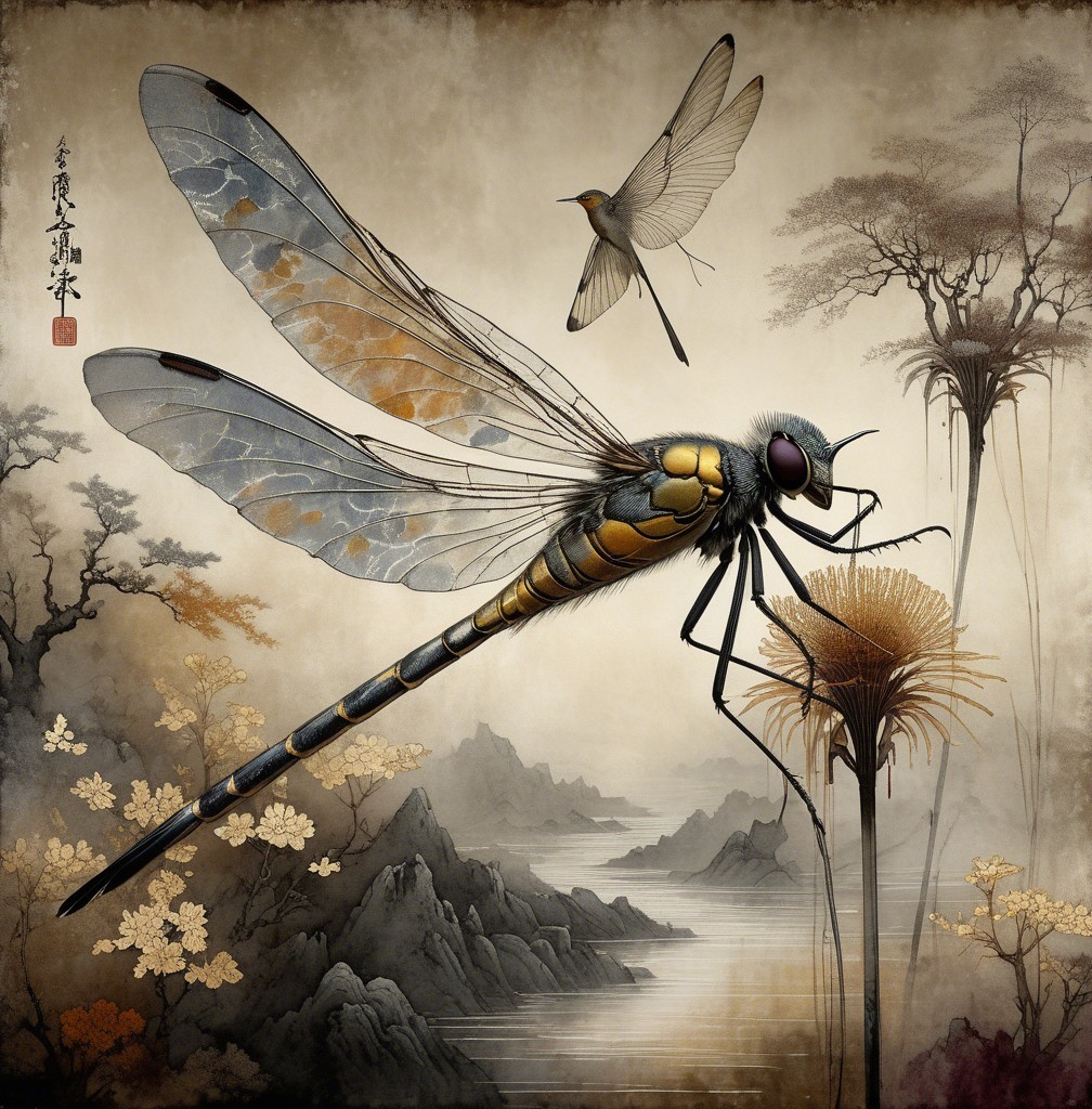A majestic bird with extended wings soars over a serene landscape, holding a golden leaf. Surrounding it are misty mountains and autumnal trees, blending traditional art with nature's beauty.