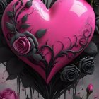 A stunning arrangement of vibrant pink roses intertwined with ornate black hearts and sparkling gemstones, set against a mysterious dark background, exuding elegance and romance.