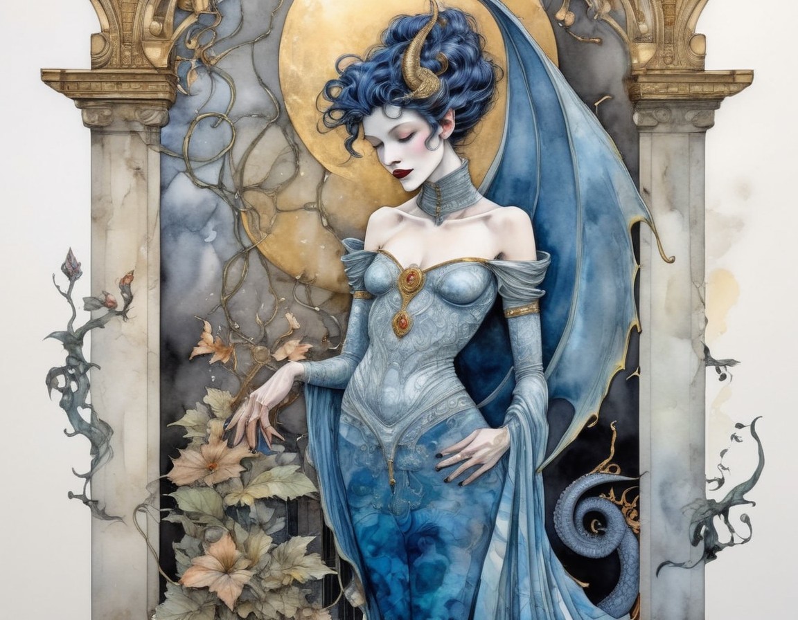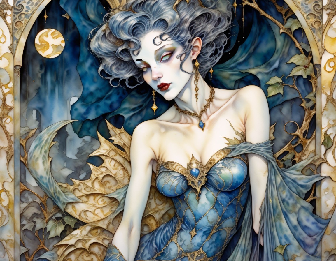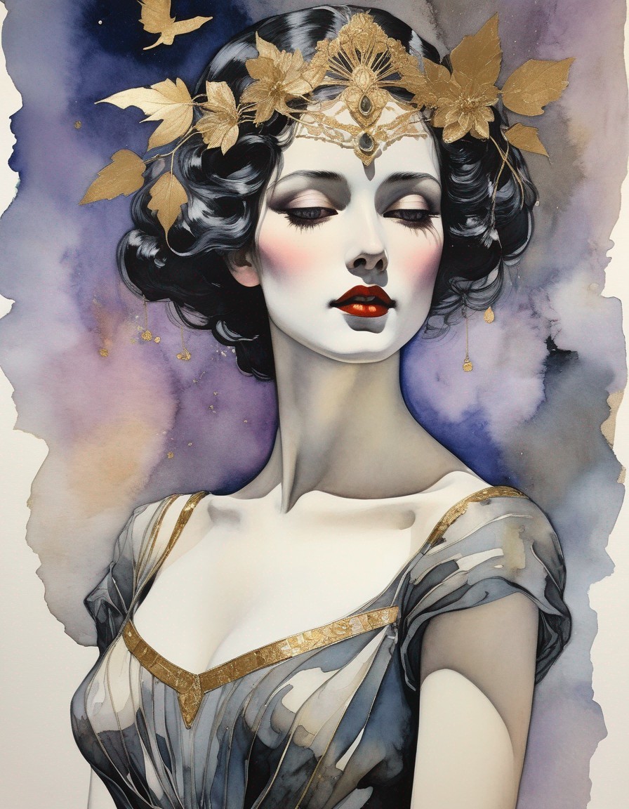 Big brown eyes. The paintings by Léon Comerre, Slawa Prischedko, John Reinhard Weguelin, and John Lavery depicted her in moody, somber, and desaturated colors, evoking a sense of melancholy and introspection. The soft, delicate lighting reminiscent of the golden hour added a touch of ethereal beauty to her already captivating presence Oh, how wild a night and she's dressed in moonlight - in her secret garden. Deathly pale and ghostly.Art deco with 3d detail and golden foil, double image, Egon Schiele, dynamic poses, silk iridescent texture in watercolor and ink, shades of black, greys with gold foil detail,colored ink drawing, watercolor artwork on old withered paper, vintage, by Caravaggio, Fragonard, Anton Pieck, pale colors, high detail, intricately detailed, hyperdetailed volumetric lighting, art nouveau graphic steampunk., whimsical, beautiful, poignant, touching. colors rose, gold, rust, burgundy, black.soft watercolor extra water in Art Deco by Annigoni, Egon Schiele, Milo Manara, Botticelli, Catrin Welz-Stein, Jean Metzinger, Klimt, perfect eyes, perfect handsface, highly detailed, complementary colors, hyper detailed.