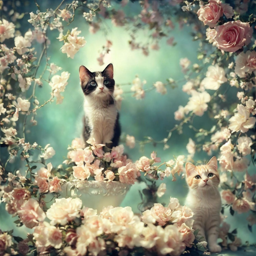 ::::: OLD STABLE VERSION ::::: Two adorable kittens amidst blooming roses under a dreamy blue sky, exuding a whimsical and serene atmosphere.