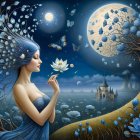 A serene woman with flowing hair holds a lotus flower against a mystical landscape, where a castle rises under a moonlit sky, and butterflies flutter among stylized trees.