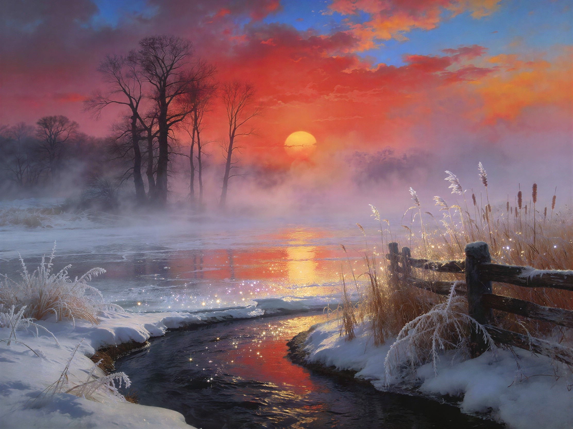 A winter landscape with snow-covered banks and a winding river under a vibrant sunset. The sun, a bright yellow orb, casts an orange and red glow across the water and foggy sky. Bare trees stand silhouetted against the colorful sky and mist on the left side of the river. The reflections