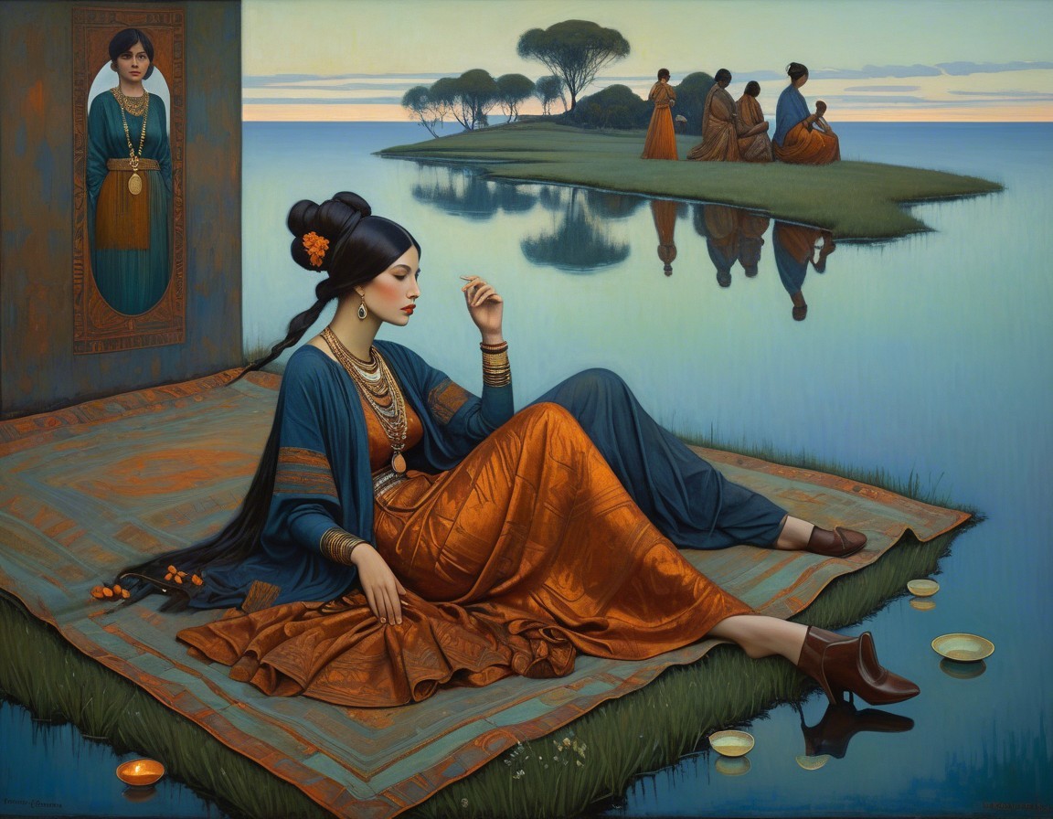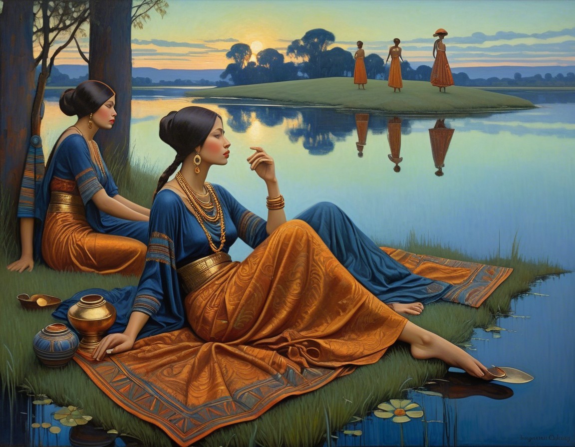 Two women in vibrant, flowing dresses sit by a serene river at sunset. Lush greenery and blooming flowers surround them, reflecting tranquil colors in the water. The scene exudes peace and harmony.