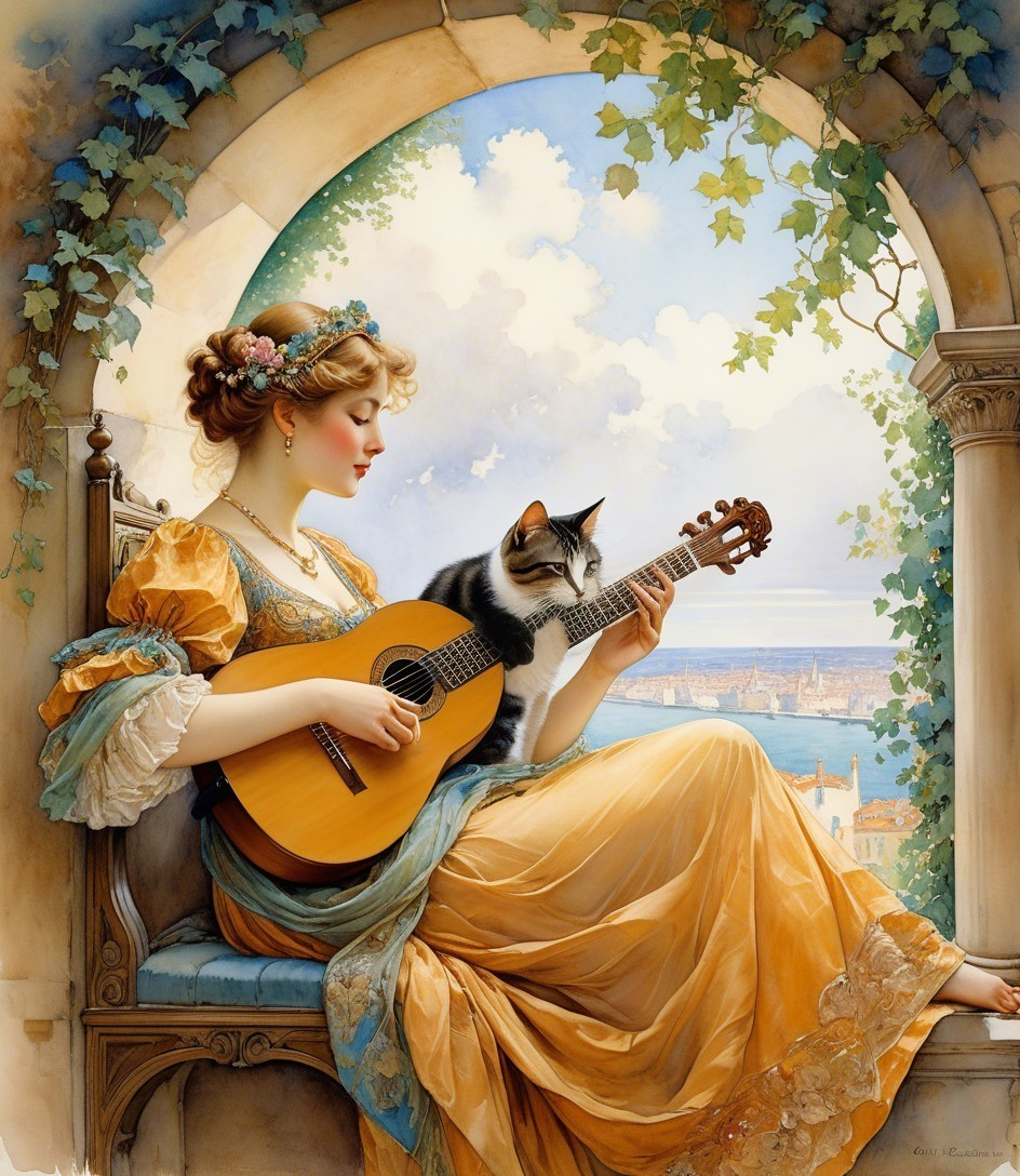 (Try from Moonhorse) - A young woman in a flowing golden gown strums a guitar while sitting in a beautifully adorned archway. A cat rests beside her, creating a serene and artistic scene with a scenic backdrop.