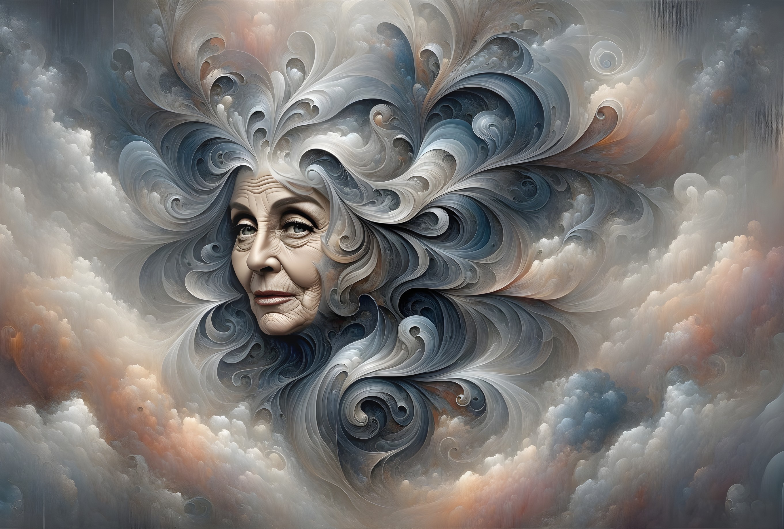 A Touch of Gray. The face of a 60-year-old woman weathered but graceful. Influenced by Alex Grey, Cameron Gray, Norman Rockwell, Annie Leibovitz. 8k, HDR. The feeling you get when you can no longer ignore your mortality but can still appreciate the dawning of a new day and smile at the journey you've lived. Graceful aged. Like vintage fine wine. Timeless beauty in every imperfection. Scars of experience. Lines well earned. An look born of wisdom. "I've been there" - and moved on. Memory tingling on the edge of mirth. You have to laugh between the tears.
