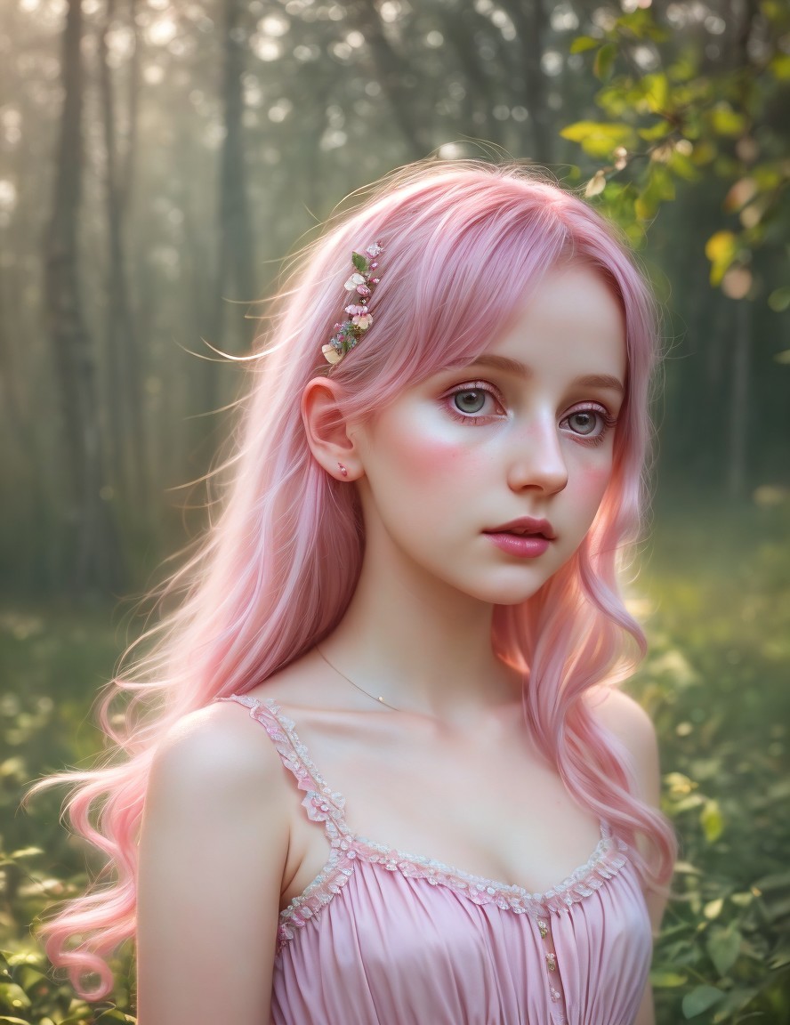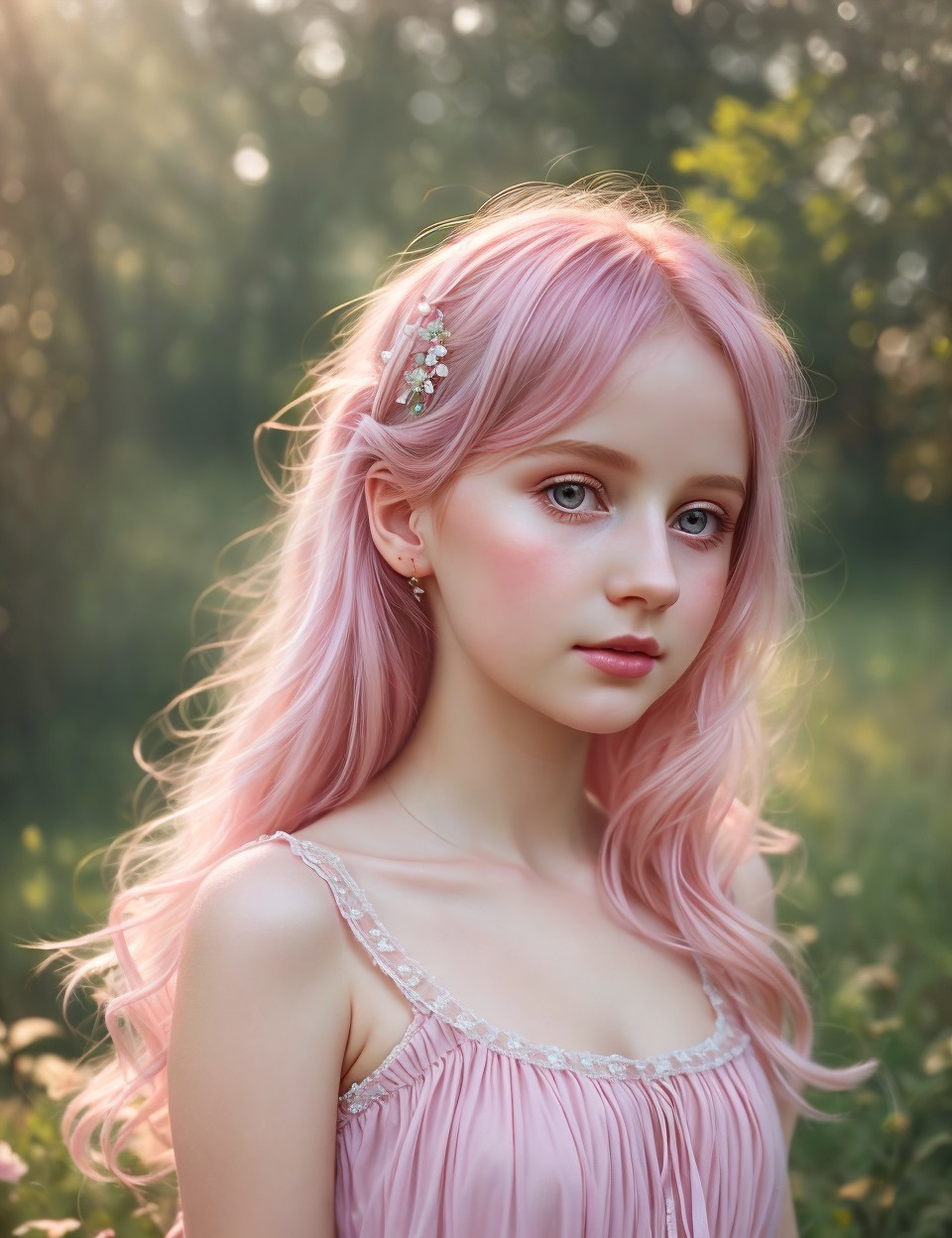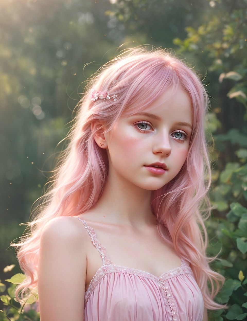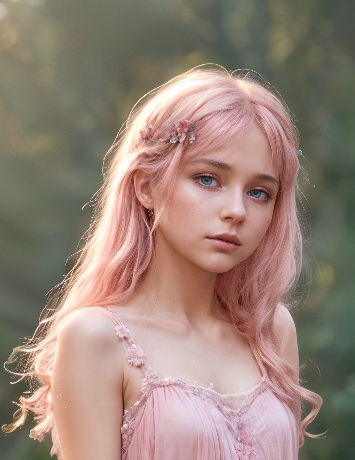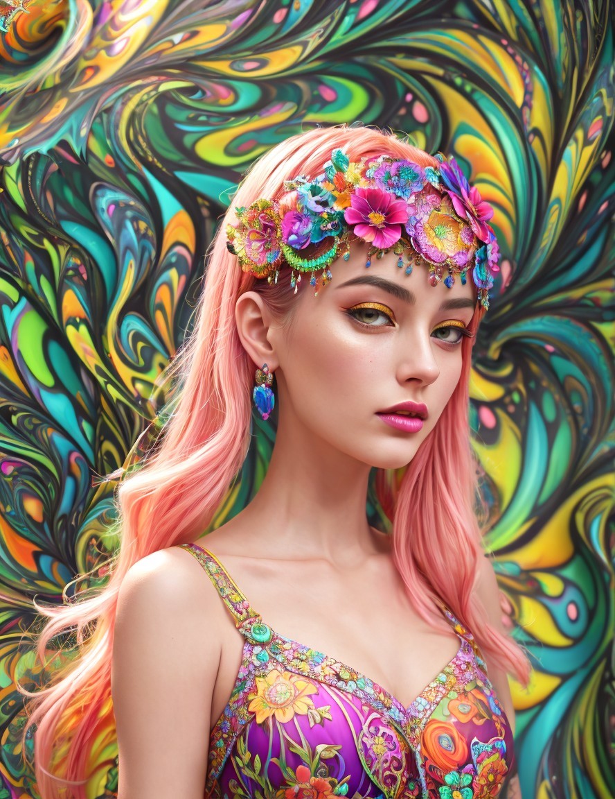 A woman with pink hair and floral adornments against a colorful psychedelic background.