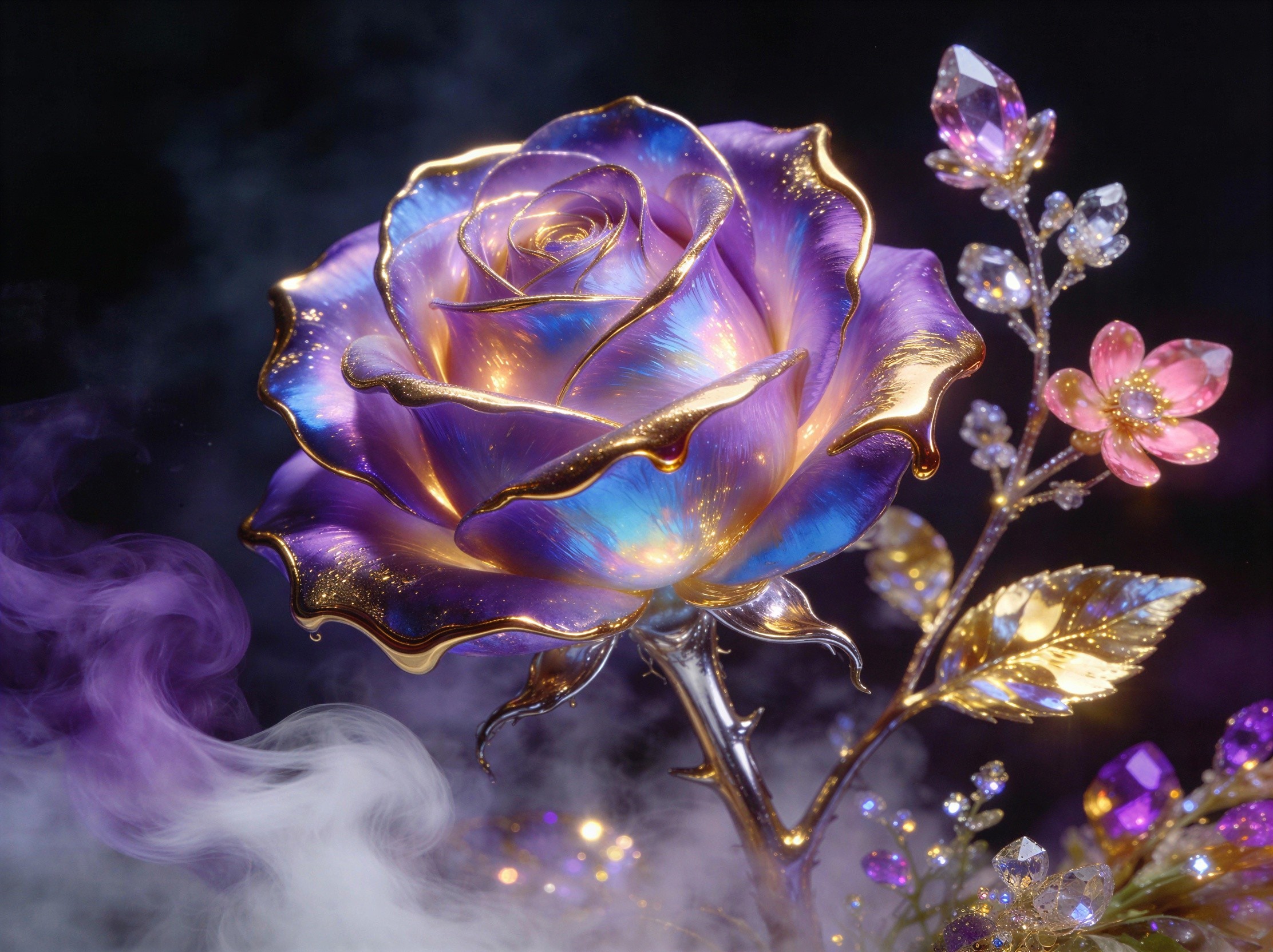 Prompt: A highly detailed close-up of a fantastical rose with iridescent purple, blue, and gold petals that glow from within against a dark, smoky background. The edges of the petals are outlined in molten gold. The rose has a metallic stem from which crystalline, jewel-like flowers and leaves sprout, reflecting light and shimmering with various shades of pink, gold, and purple. Wisps of purple and white smoke or mist swirl around the lower part of the rose and the sparkling foliage, creating a magical and ethereal atmosphere. The image is rendered in a realistic, hyper-detailed, and glamorous style, with a shallow depth of field focusing on the rose.