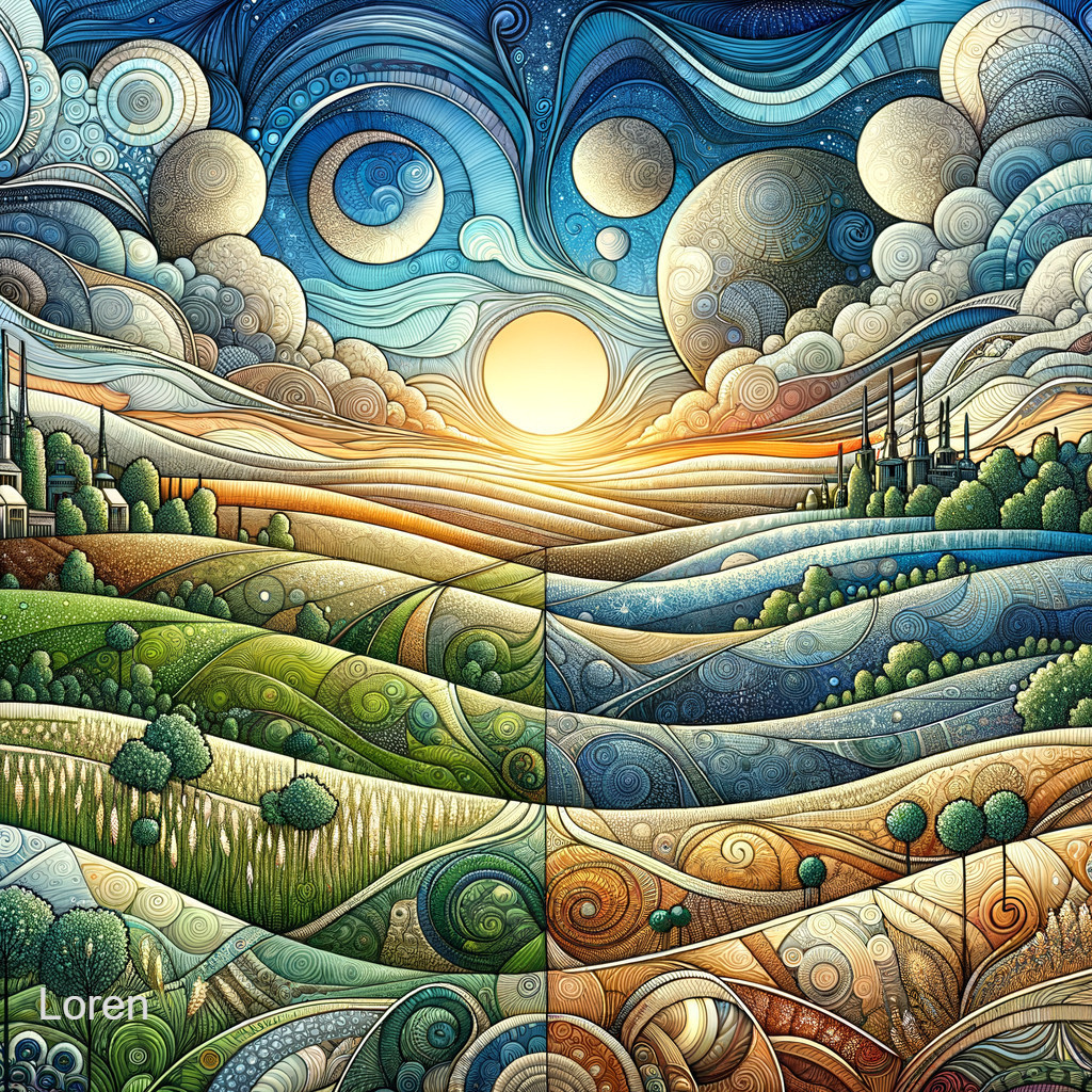 The description portrays a cherished land with vibrant imagery of nature, pathways, and hills under a beautiful sky. It evokes a sense of tranquility and wonder through various artistic styles like zentangle, paisley, and mandala, along with mentions of renowned artists and digital painting techniques.