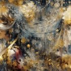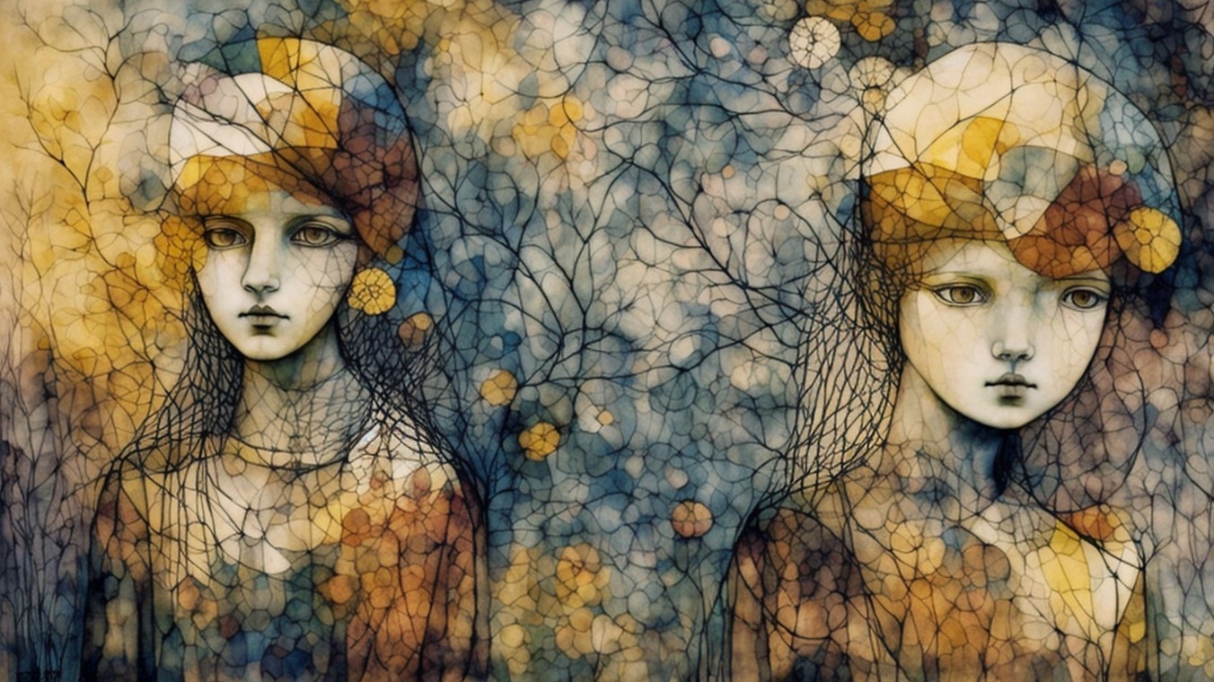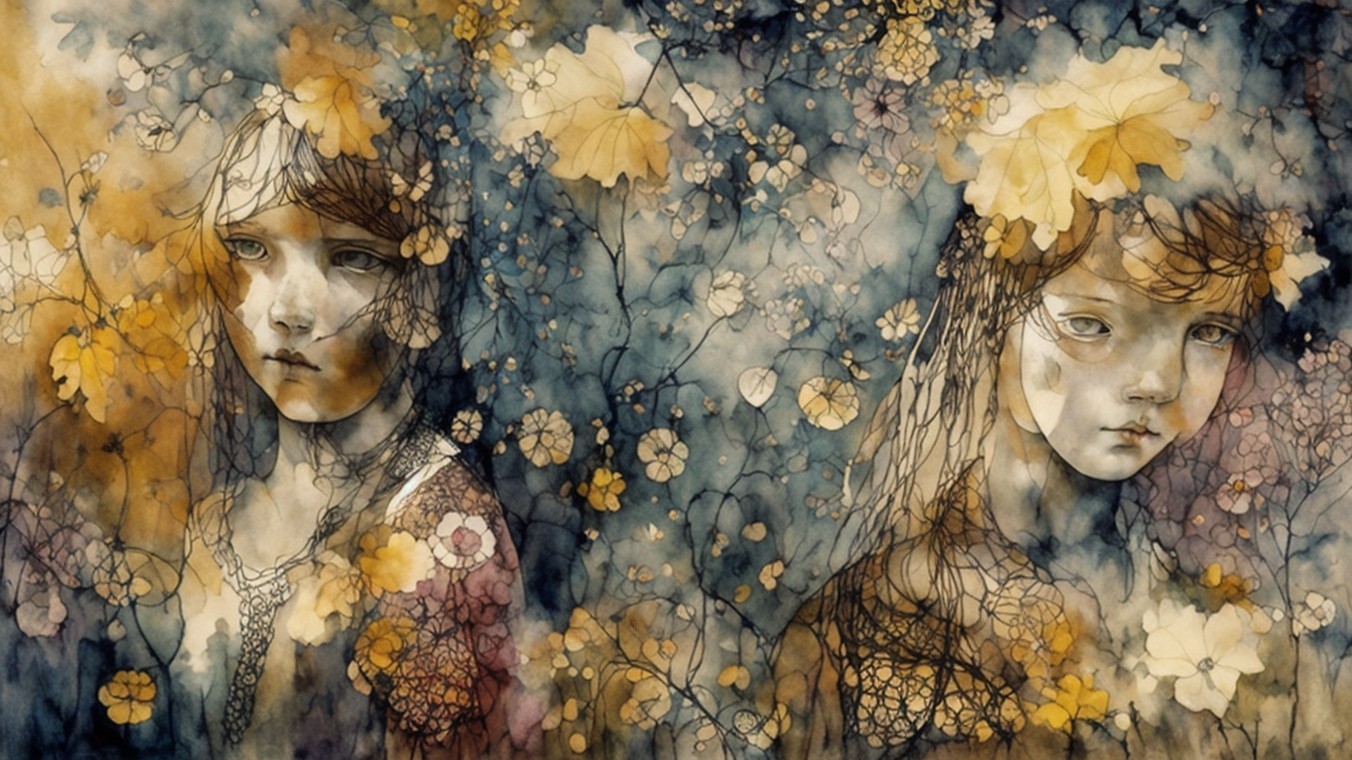 The image features a stylized girl with large eyes and light brown hair, surrounded by abstract leaves in warm tones. Her expression is calm, with an earthy, artistic background enhancing the scene.