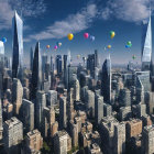A futuristic cityscape features towering skyscrapers alongside a massive, reflective orb containing lush greenery, with various planets hovering in a vibrant sky, blending nature and urban life.