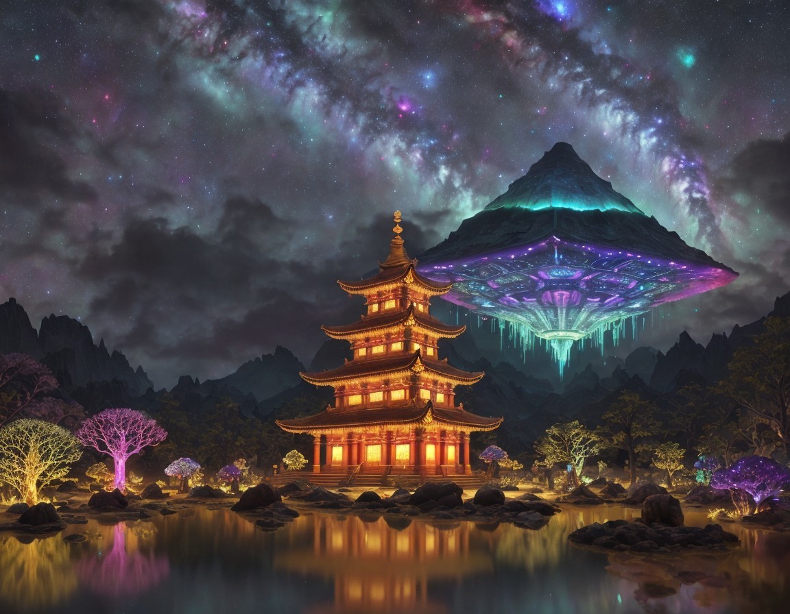 A fantasy landscape with vibrant alien structures under a starry sky with colorful nebulae.