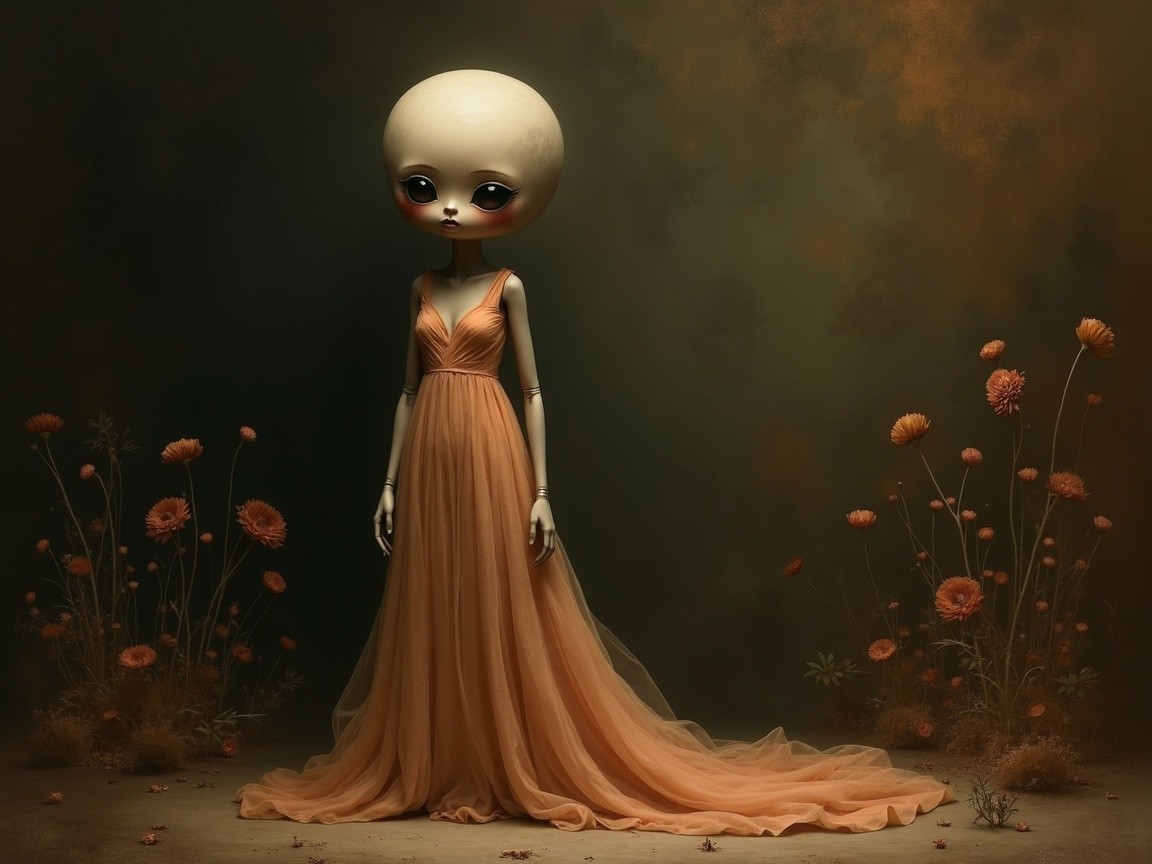 A whimsical character with large eyes and an oversized, rounded hairstyle stands in a flowing, layered gown surrounded by delicate flowers, evoking a dreamlike, surreal atmosphere.