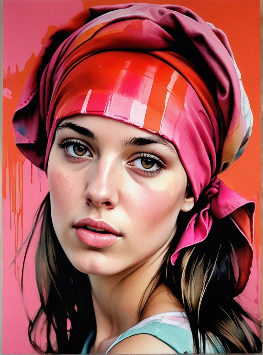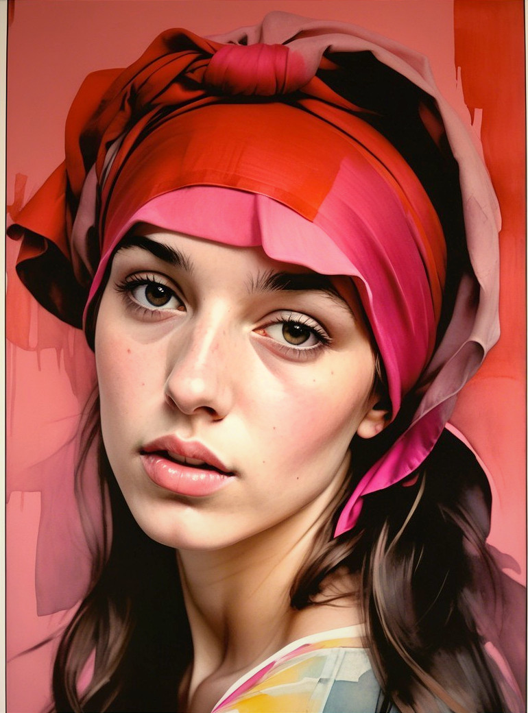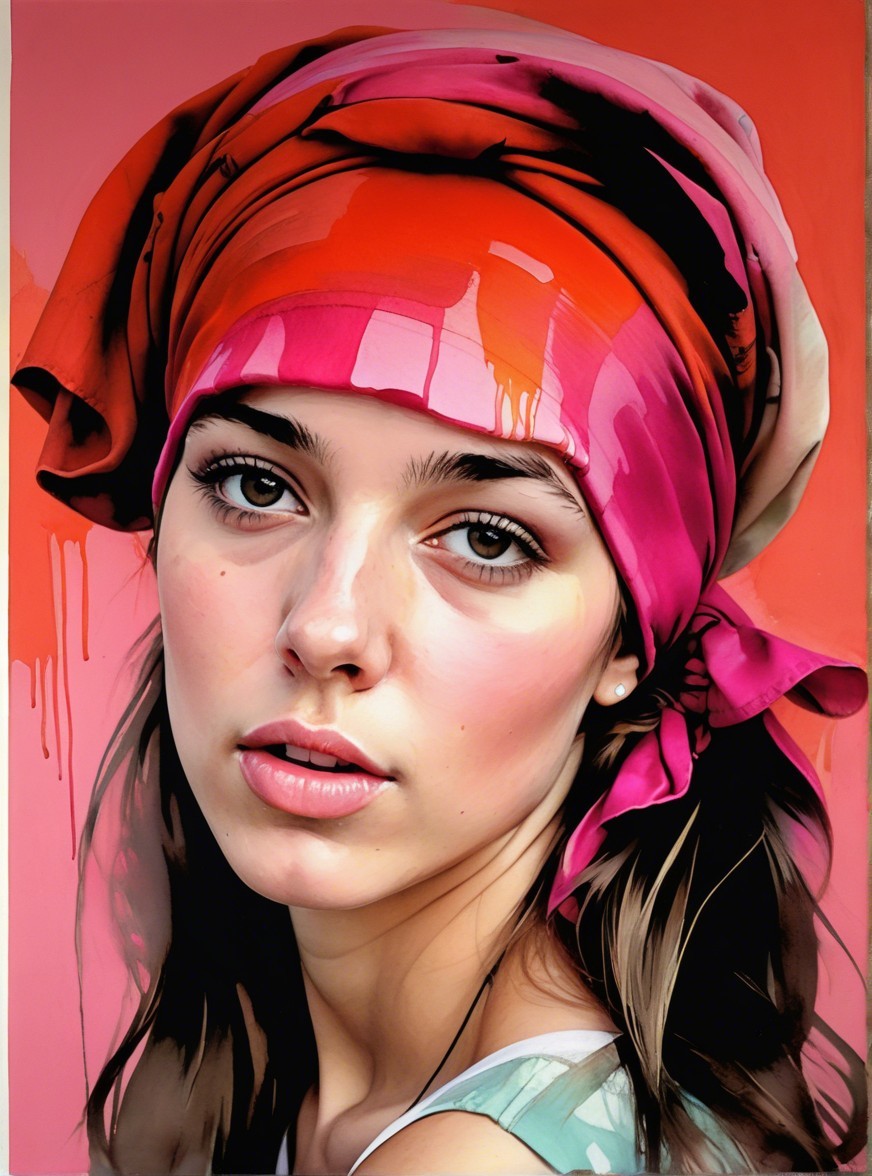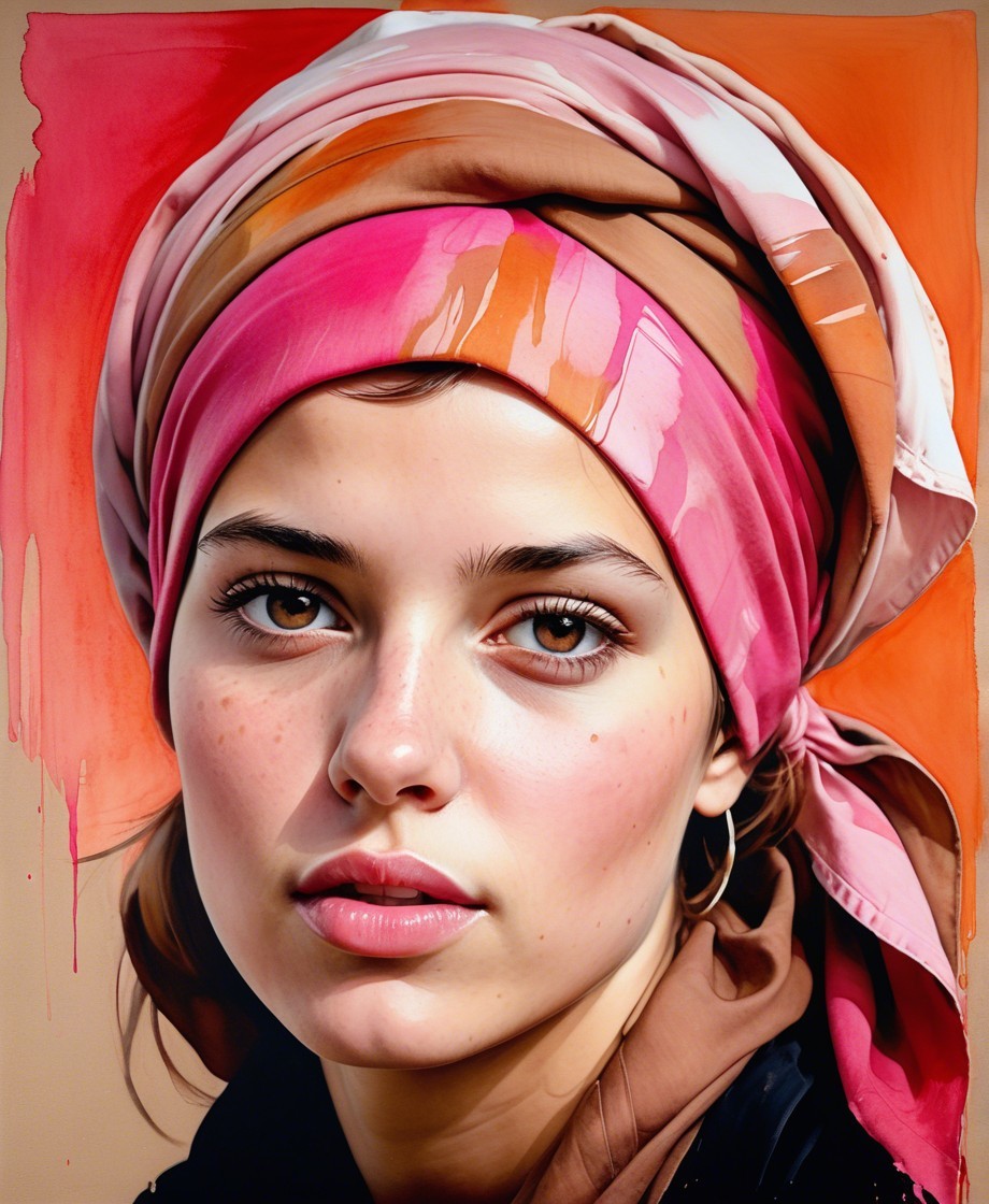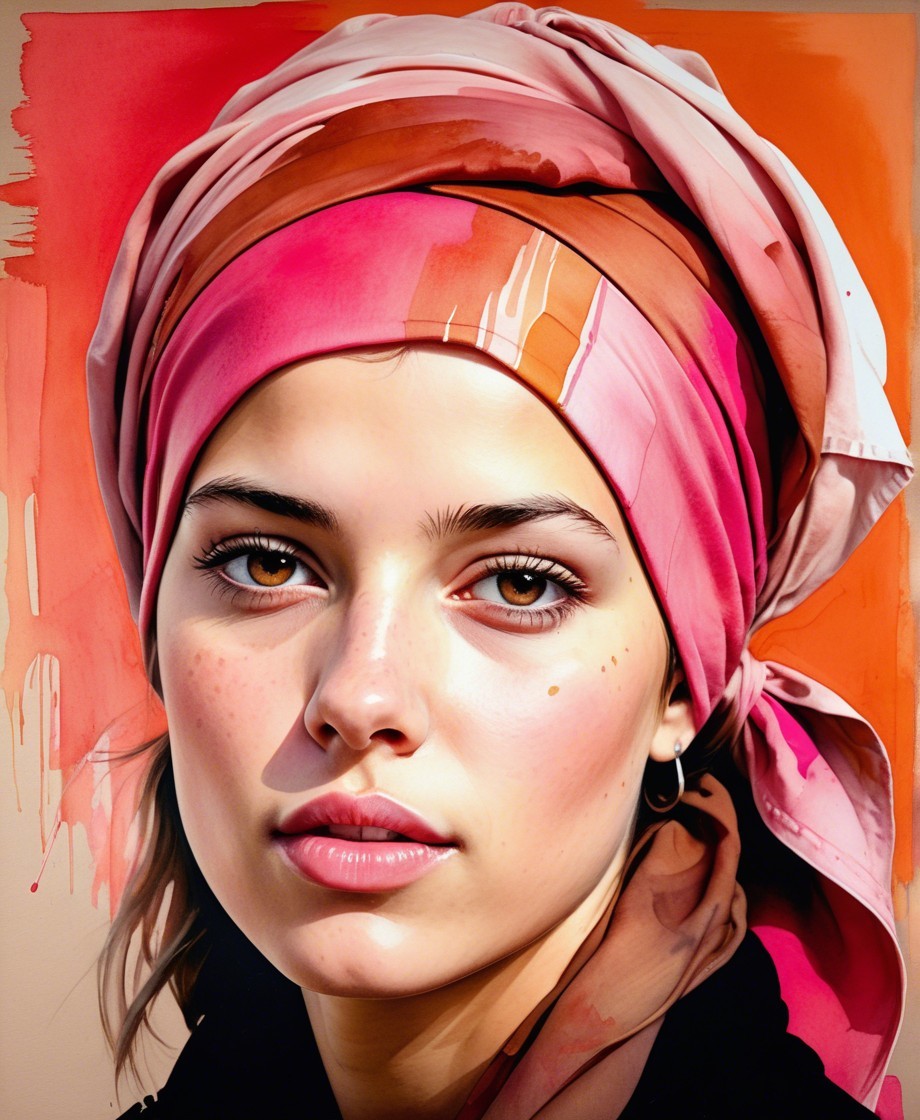 Prompt: Vivid portrait, upper body shot with pink headscarf, juvenile, feminine, shabby chic, top-to-bottom perspective, stylized by Jenny Saville, kinetic, hues and tints by Ho Baron and Jasper Johns, visible textures, --ar 1:1 --q 2 --s 750, brightened color palette, multi-layered eyes, stylized hairdo, post-avantgarde style, fine-line illustration, gradient inking, raytraced shadows, 3D effects, movie still, subsurface scattering 1.3, watercolor, warm gradient inking colors, reddish-brown tones, wavery coloring, dry ink brush outlines, splash ink technique in style of Marc Allante, colorful yam, portrait inspired by Michael Whelan and Ho Baron and Lyonel Feininger, overall composition by Pascale Campion, vivid polished coloring, rim lighting, airbrush style for ambient occlusion, simplistic parallax occlusion 1.3, great depth and scale, detailed juminocore style, op-art influence, meticulous linework adding depth and intricacy, fissured hues in a plique-à-jour technique, stylized, dynamic lighting effects, brightness 1.5, raytraced shadows 1.6, dyed, ambient occlusion 1.3, background with dripping effects, flares and splashes, negative lucas numbers, shimmering light reflections, over the watercolor effects by Darren Waterston in psychedelic style, focusing on 3D textures and raytraced shadows. Emphasize volumetric lighting for an ethereal ambiance, maintaining pencil sharp edges, only curves, color shapes, opaque, translucent, peated, visible textures, glow effect with only curves, ensuring a mix of visible textures and a mesmerizing RHADS aesthetic. geometrical intricate linework, ghostly, vibrant watercolor overspray technique, diverse color palette, hair flowing like a sculpted illusion, ethereal ambiance, fabric layers merging with dynamic flares, serene, rugged, liminal, luminosity, crisp quality, plasticity, splashy dramatic lighting, color scheme inspired by Ho Baron, lighting reminiscent of Ed Paschke, wavery texture, intricately clear, LiDAR point cloud.