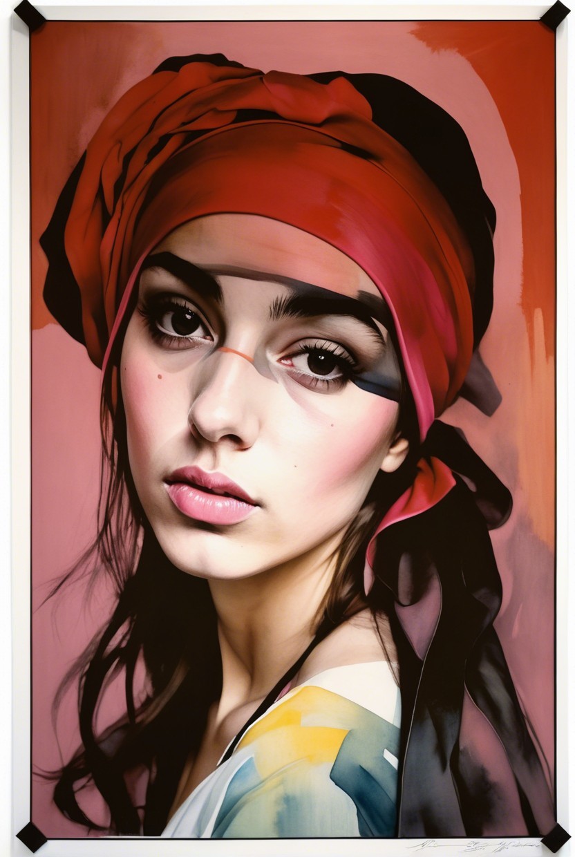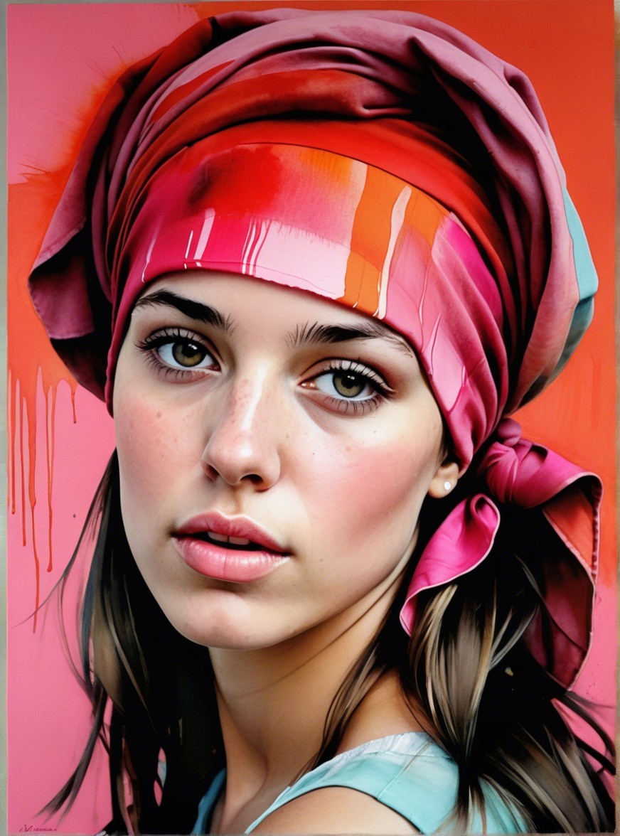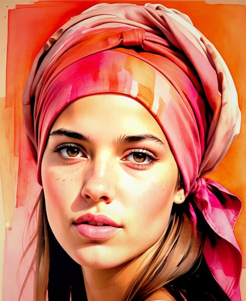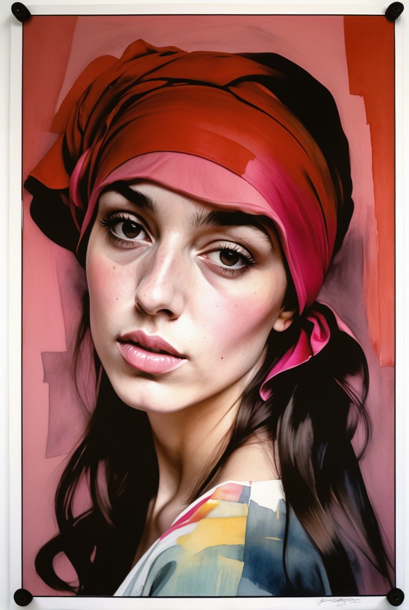 Prompt: Vivid portrait, upper body shot with pink headscarf, juvenile, feminine, shabby chic, top-to-bottom perspective, stylized by Jenny Saville, kinetic, hues and tints by Ho Baron and Jasper Johns, visible textures, --ar 1:1 --q 2 --s 750, brightened color palette, multi-layered eyes, stylized hairdo, post-avantgarde style, fine-line illustration, gradient inking, raytraced shadows, 3D effects, movie still, subsurface scattering 1.3, watercolor, warm gradient inking colors, reddish-brown tones, wavery coloring, dry ink brush outlines, splash ink technique in style of Marc Allante, colorful yam, portrait inspired by Michael Whelan and Ho Baron and Lyonel Feininger, overall composition by Pascale Campion, vivid polished coloring, rim lighting, airbrush style for ambient occlusion, simplistic parallax occlusion 1.3, great depth and scale, detailed juminocore style, op-art influence, meticulous linework adding depth and intricacy, fissured hues in a plique-à-jour technique, stylized, dynamic lighting effects, brightness 1.5, raytraced shadows 1.6, dyed, ambient occlusion 1.3, background with dripping effects, flares and splashes, negative lucas numbers, shimmering light reflections, over the watercolor effects by Darren Waterston in psychedelic style, focusing on 3D textures and raytraced shadows. Emphasize volumetric lighting for an ethereal ambiance, maintaining pencil sharp edges, only curves, color shapes, opaque, translucent, peated, visible textures, glow effect with only curves, ensuring a mix of visible textures and a mesmerizing RHADS aesthetic. geometrical intricate linework, ghostly, vibrant watercolor overspray technique, diverse color palette, hair flowing like a sculpted illusion, ethereal ambiance, fabric layers merging with dynamic flares, serene, rugged, liminal, luminosity, crisp quality, plasticity, splashy dramatic lighting, color scheme inspired by Ho Baron, lighting reminiscent of Ed Paschke, wavery texture, intricately clear, LiDAR point cloud.