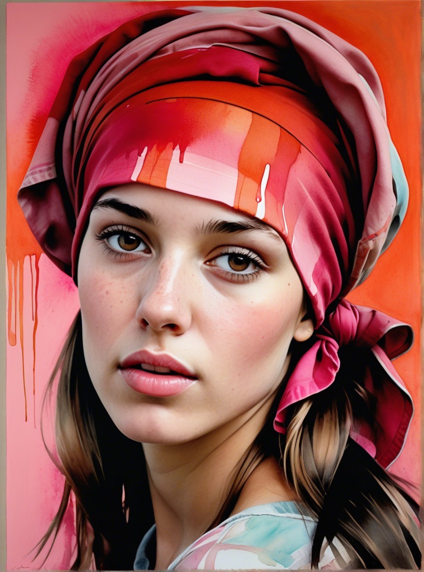 Vivid portrait, upper body shot with pink headscarf, juvenile, feminine, shabby chic, top-to-bottom perspective, stylized by Jenny Saville, kinetic, hues and tints by Ho Baron and Jasper Johns, visible textures, --ar 1:1 --q 2 --s 750, brightened color palette, multi-layered eyes, stylized hairdo, post-avantgarde style, fine-line illustration, gradient inking, raytraced shadows, 3D effects, movie still, subsurface scattering 1.3, watercolor, warm gradient inking colors, reddish-brown tones, wavery coloring, dry ink brush outlines, splash ink technique in style of Marc Allante, colorful yam, portrait inspired by Michael Whelan and Ho Baron and Lyonel Feininger, overall composition by Pascale Campion, vivid polished coloring, rim lighting, airbrush style for ambient occlusion, simplistic parallax occlusion 1.3, great depth and scale, detailed juminocore style, op-art influence, meticulous linework adding depth and intricacy, fissured hues in a plique-à-jour technique, stylized, dynamic lighting effects, brightness 1.5, raytraced shadows 1.6, dyed, ambient occlusion 1.3, background with dripping effects, flares and splashes, negative lucas numbers, shimmering light reflections, over the watercolor effects by Darren Waterston in psychedelic style, focusing on 3D textures and raytraced shadows. Emphasize volumetric lighting for an ethereal ambiance, maintaining pencil sharp edges, only curves, color shapes, opaque, translucent, peated, visible textures, glow effect with only curves, ensuring a mix of visible textures and a mesmerizing RHADS aesthetic. geometrical intricate linework, ghostly, vibrant watercolor overspray technique, diverse color palette, hair flowing like a sculpted illusion, ethereal ambiance, fabric layers merging with dynamic flares, serene, rugged, liminal, luminosity, crisp quality, plasticity, splashy dramatic lighting, color scheme inspired by Ho Baron, lighting reminiscent of Ed Paschke, wavery texture, intricately clear, LiDAR point cloud.