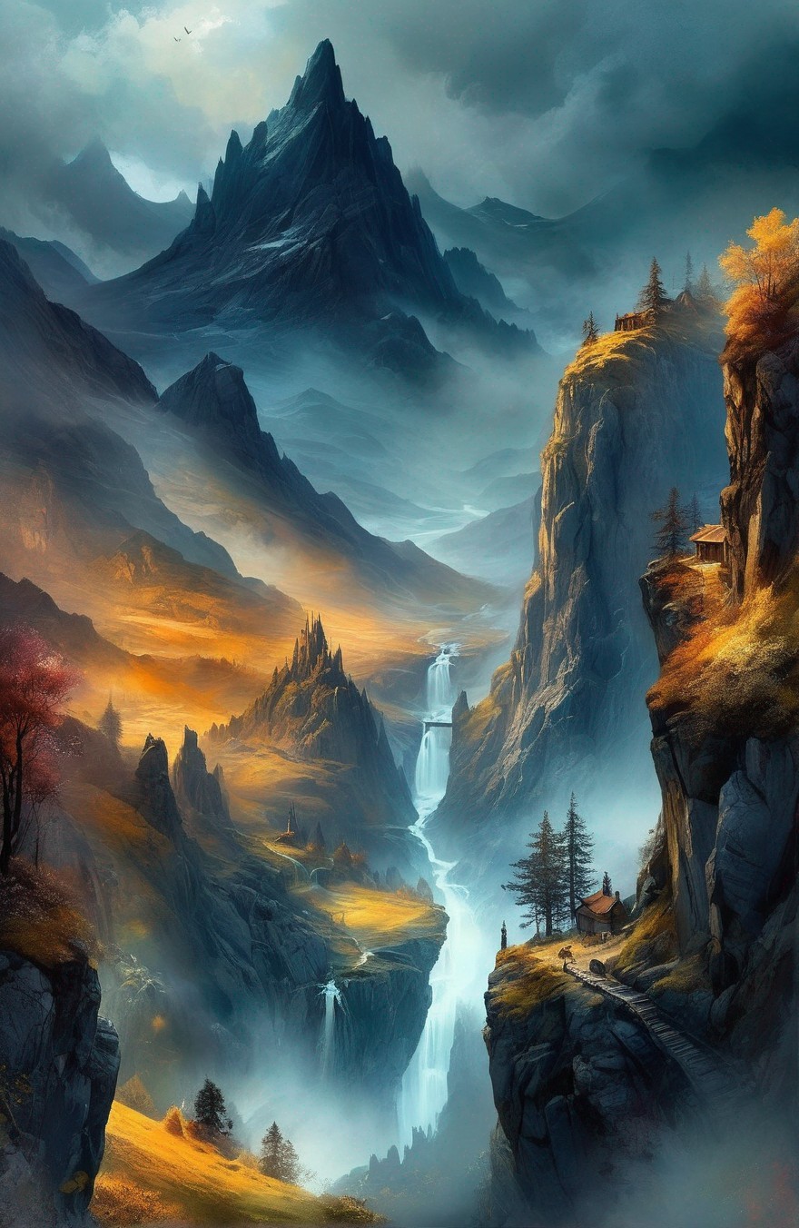 + Prompt:A mountain pass with breathtaking views Muted coloured art in the style of by Alexander Jansson,,mind blowing landscape ,dramatic fantastical, surrealistic, elegant, beautiful, high definition, striking drawing, artstation, intricate, award winning, fantastic view, fantasy, elaborate, HDR, crisp quality,, heavenly