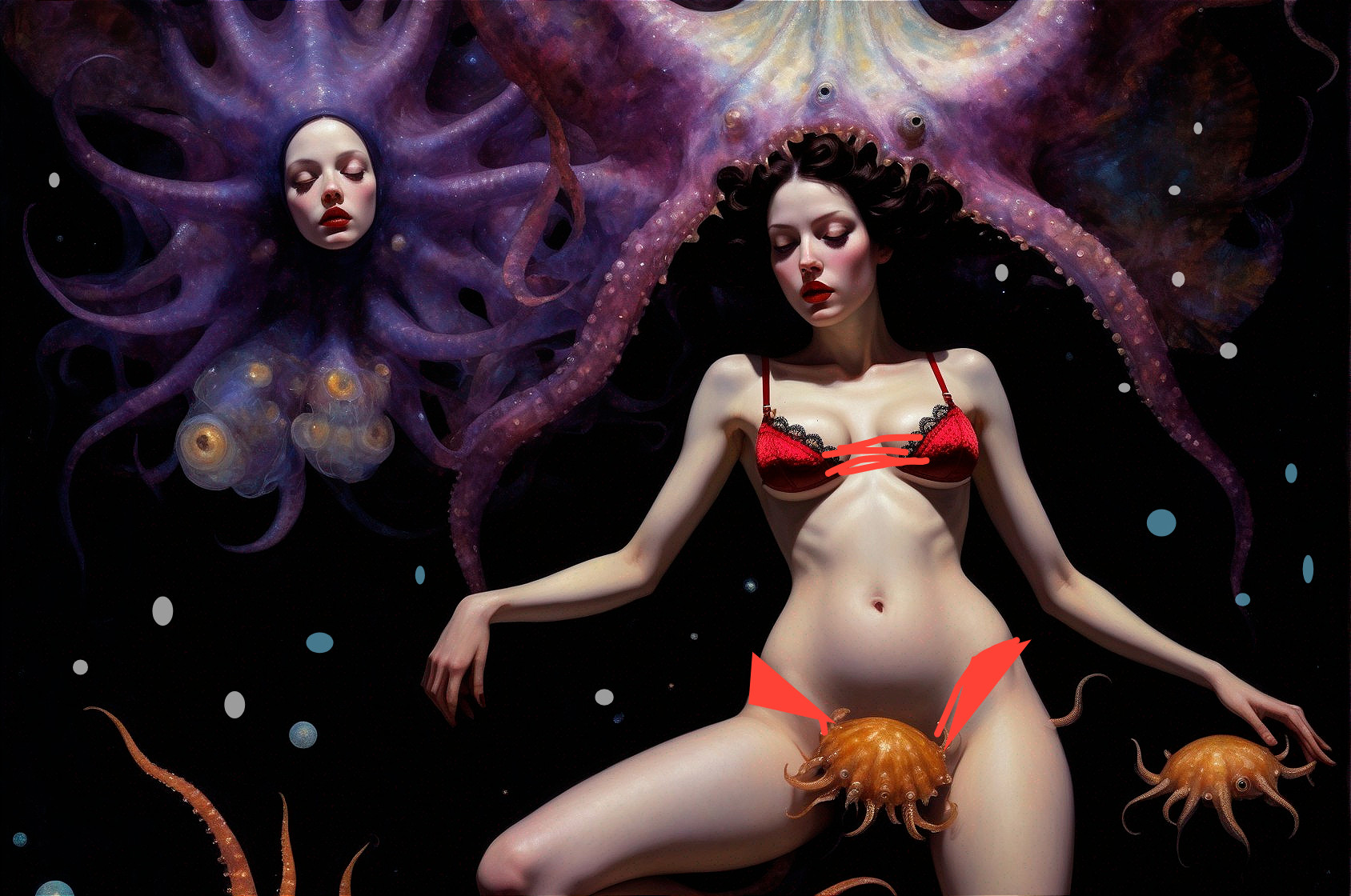 Two women underwater with jellyfish-like hair amidst floating jellyfish, adorned in coral-themed attire, exuding a surreal, ethereal vibe.