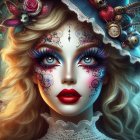 A glamorous figure with intricate makeup featuring vibrant blue eyes, bold lipstick, and decorative facial designs. She sports elegant, voluminous blonde hair adorned with colorful accessories.