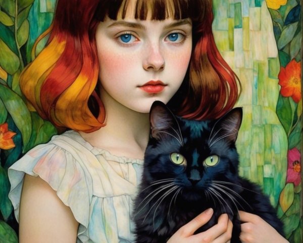 A young woman with curly, vibrant hair cradles colorful roses against a softly blended background. Her expressive eyes and delicate features convey a sense of grace and tranquility.