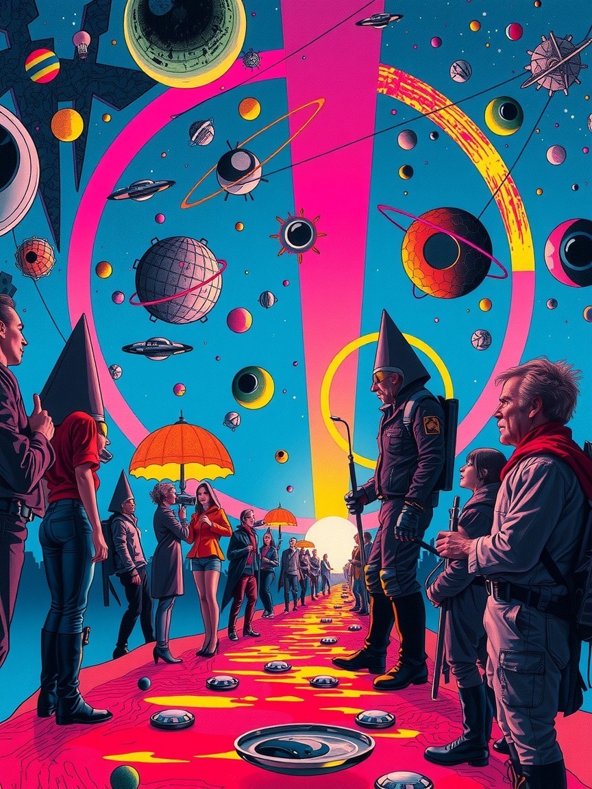 Prompt: "Blotter art space opera print, 1960's sci-fi comic book stylized fine art, Wall art By Hieronymus Bosch with a cosmicomics motifs and italo calvino vibe, in a masterful mix of glorious glowing neon Technicolor blended with Hermes classic colors, trending on Artstation, high definition, crisp quality."