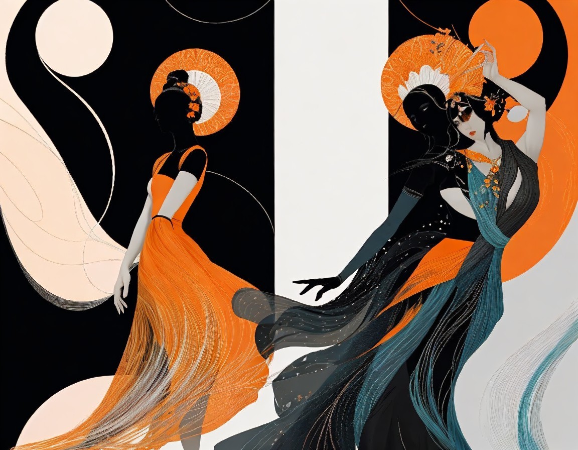 An illustrated woman in a flowing teal dress with black hair, against an orange and white abstract background.