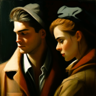 A close portrait of a man and woman, both wearing stylish hats and colorful attire. They share an intimate moment, their faces nearly touching, set against an abstract, vibrant background.