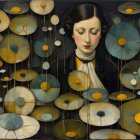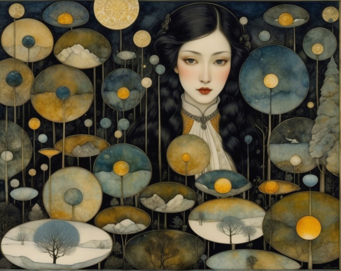 A serene woman in a blue robe stands amidst a snowy landscape, surrounded by foxes and mystical trees. The night sky features a full moon, adding an enchanting atmosphere to the scene.